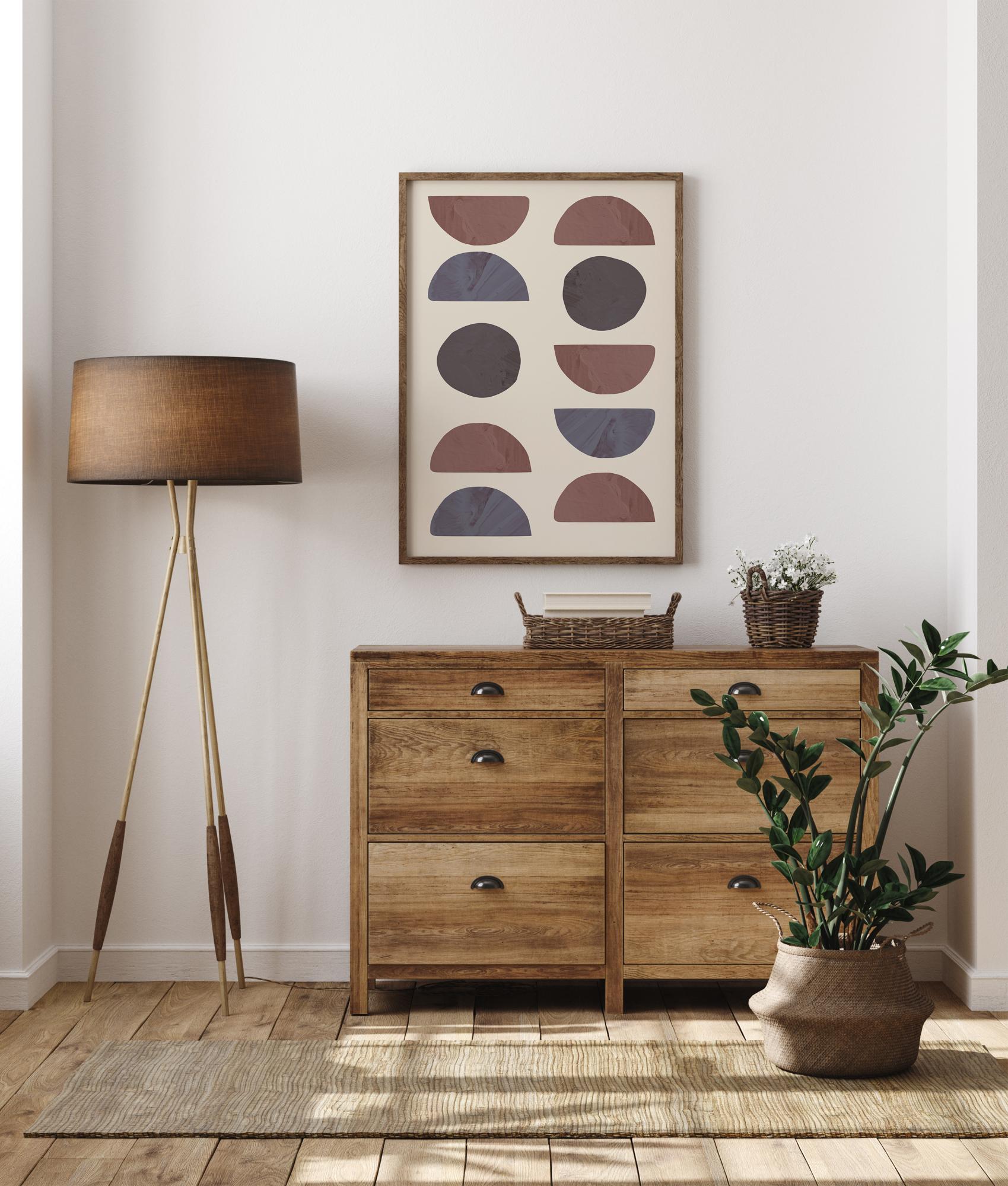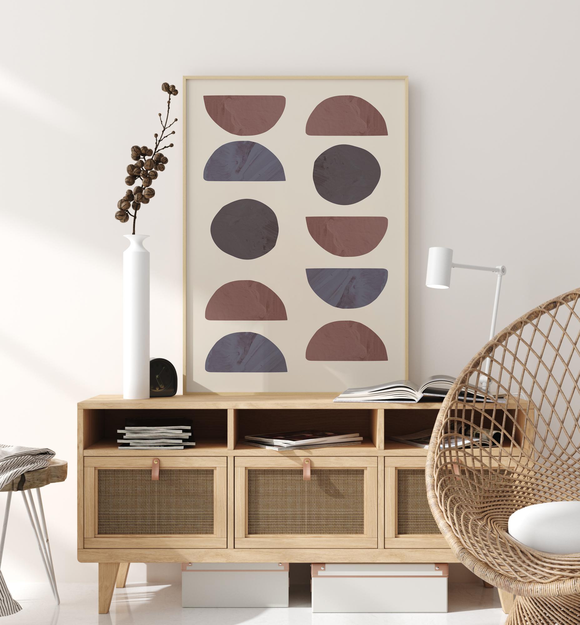 En abstrakt poster fylld med olika halvcirklar och cirkulära former. Det finns två rader med former som har olika mönster av cirklar och halvcirklar, allt i olika nyanser av blått, grått och rött. Liva upp en enkel vägg i huset med dessa geometriska former.