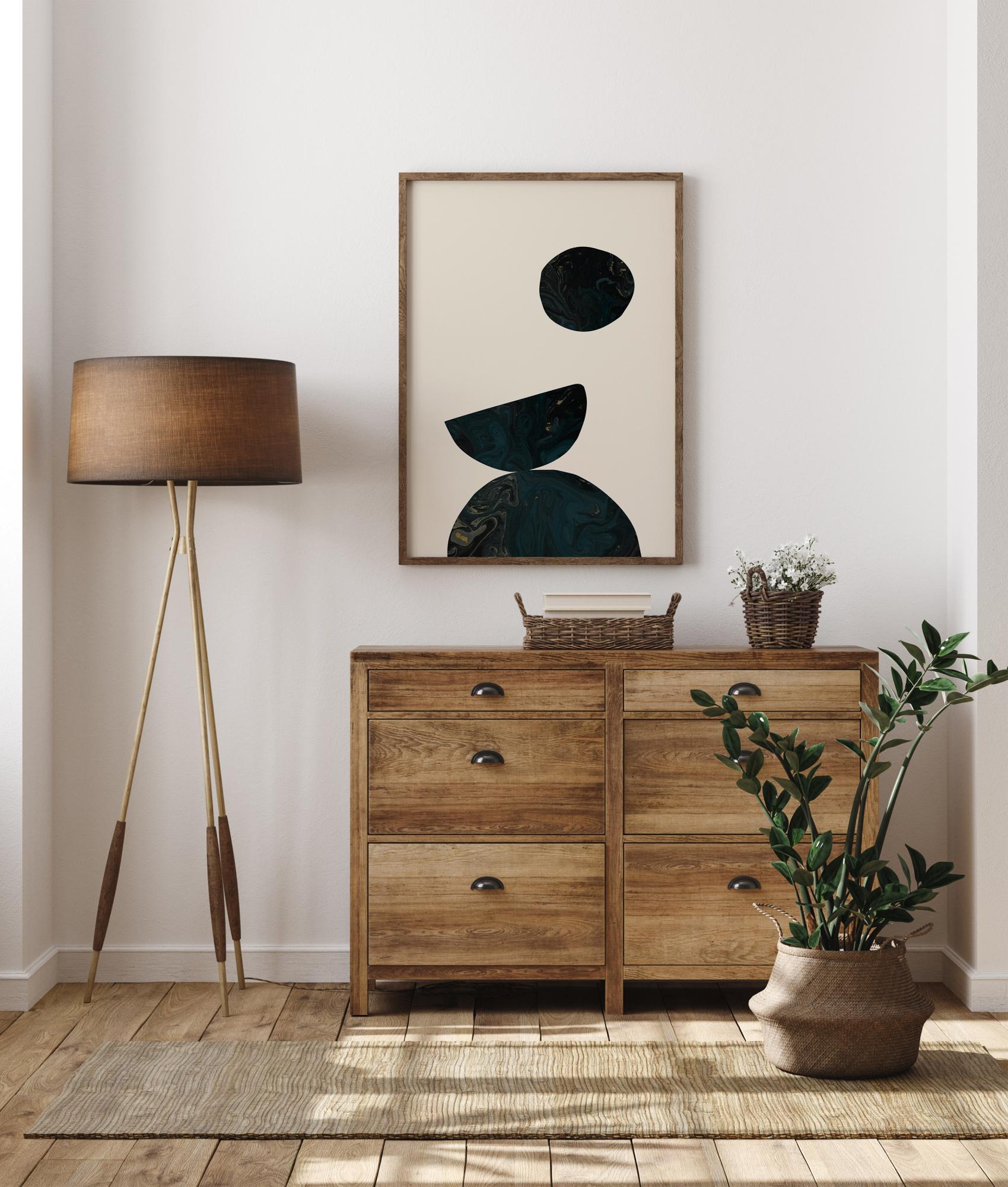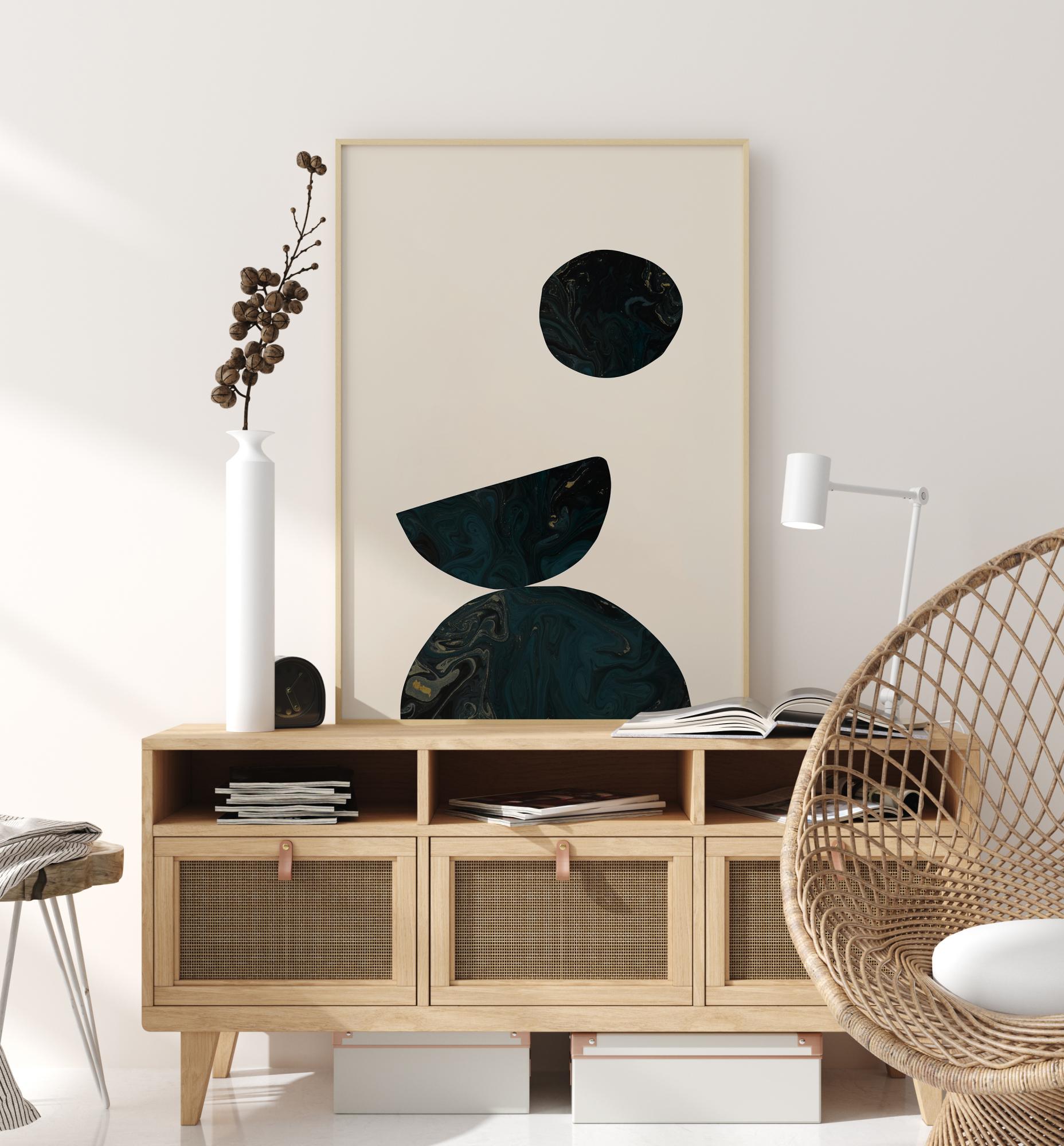 En ljus poster med tre mörkblå och svarta former som skapar en slående bild. En halvcirkel är placerad i botten och balanserar en annan uppochnervänd halvcirkel. Ovanför svävar en svart cirkel. Allt är mot en kontrasterande vit bakgrund. Matcha de vackra marmorerade virvlarna med en blekare ton på väggarna för extra drama.