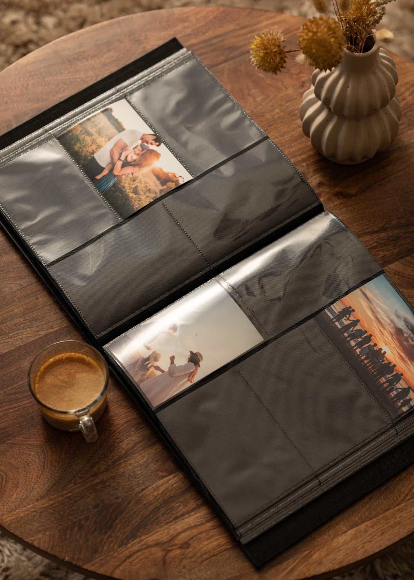 Det unika med detta fotoalbum är dess praktiska fotofickor, vilket gör det enkelt att montera och byta ut bilder utan krångel. Bildorienteringen i albumet är både liggande och stående, vilket ger dig flexibilitet att arrangera dina bilder precis som du vill. De svarta sidorna skapar en vacker kontrast mot dina färgglada fotografier och framhäver varje bild på bästa sätt.