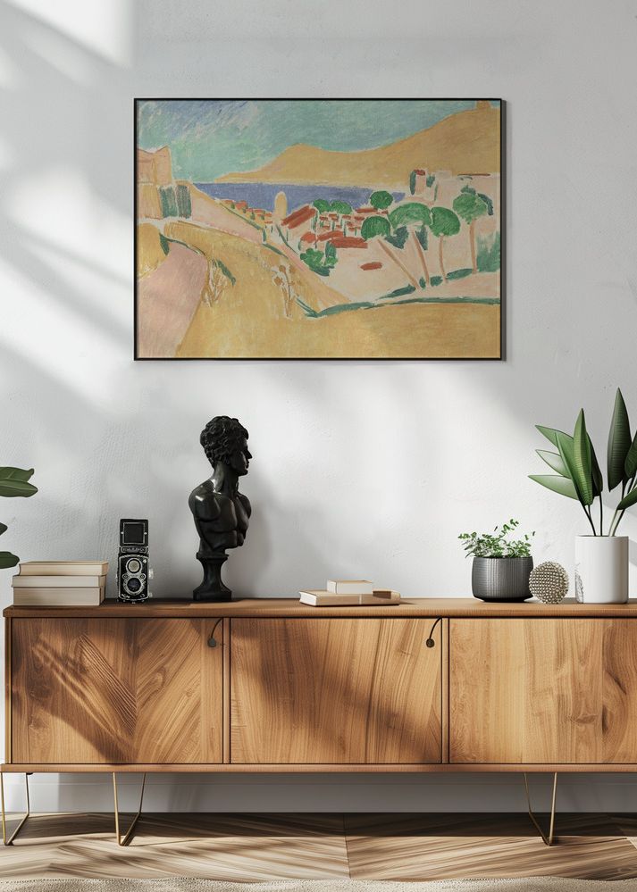 Denna poster fångar skönheten i ett kustlandskap med en härlig blandning av mjuka och livfulla färger. Motivet framhäver en vacker kustlinje med byggnader, gröna träd och en glittrande havsvik i bakgrunden. Den moderna affischen ger en känsla av frihet och lugn, perfekt för att förnya ditt utrymme med en touch av konstnärlig elegans. Upptäck hur denna konstprint kan bli ett centralt samtalsämne i ditt hem.