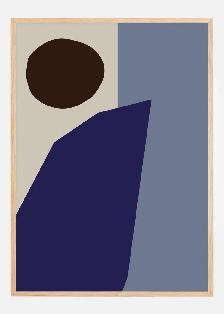 En elegant poster med vinkelformer i blockfärger. En fin mörkblå form går över bilden från vänster medan en rektangulär ljusblå form delar av bilden. Ovanför är det en svart cirkel på en vit bakgrund. Lägg märke till den här bilden varje morgon när den hänger i din hall.