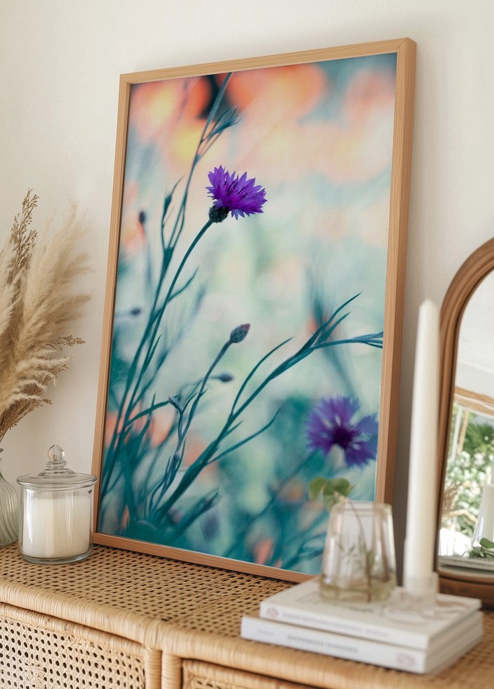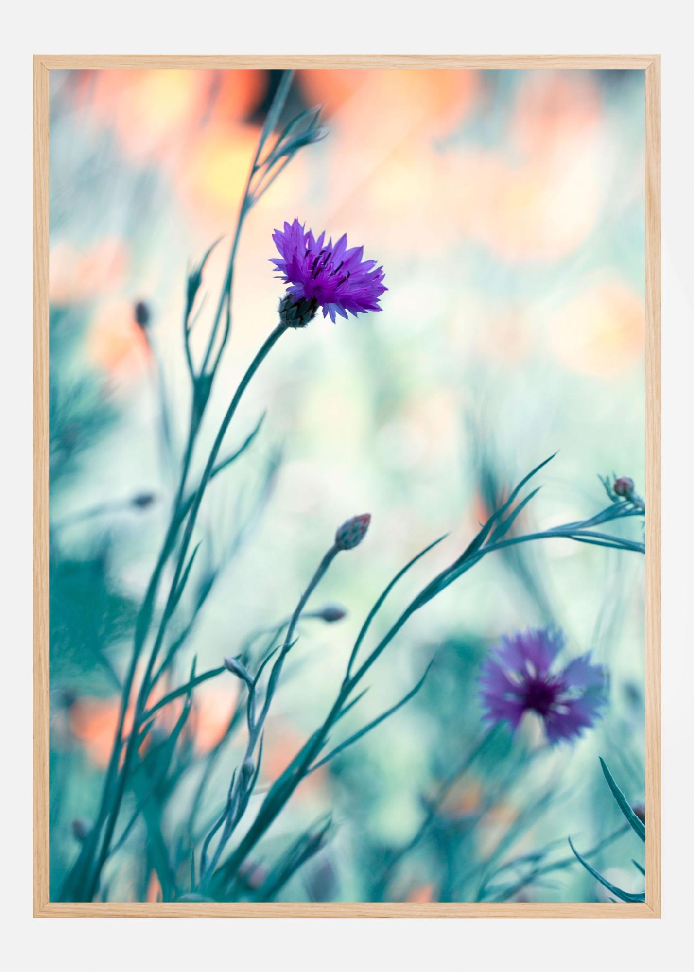 Denna vackra poster fångar essensen av en blomstrande äng med sin livfulla detaljrikedom och harmoniska färgpalett. Motivet visar ståtliga blommor i klarlila som stolt sträcker sig mot himlen, omgivna av mjuka, dämpade nyanser av turkost och grönt. Den suddiga bakgrunden ger en känsla av lugn och djup som fördjupar upplevelsen av verket. En perfekt print för dem som älskar natur och subtil elegans i sin inredning.