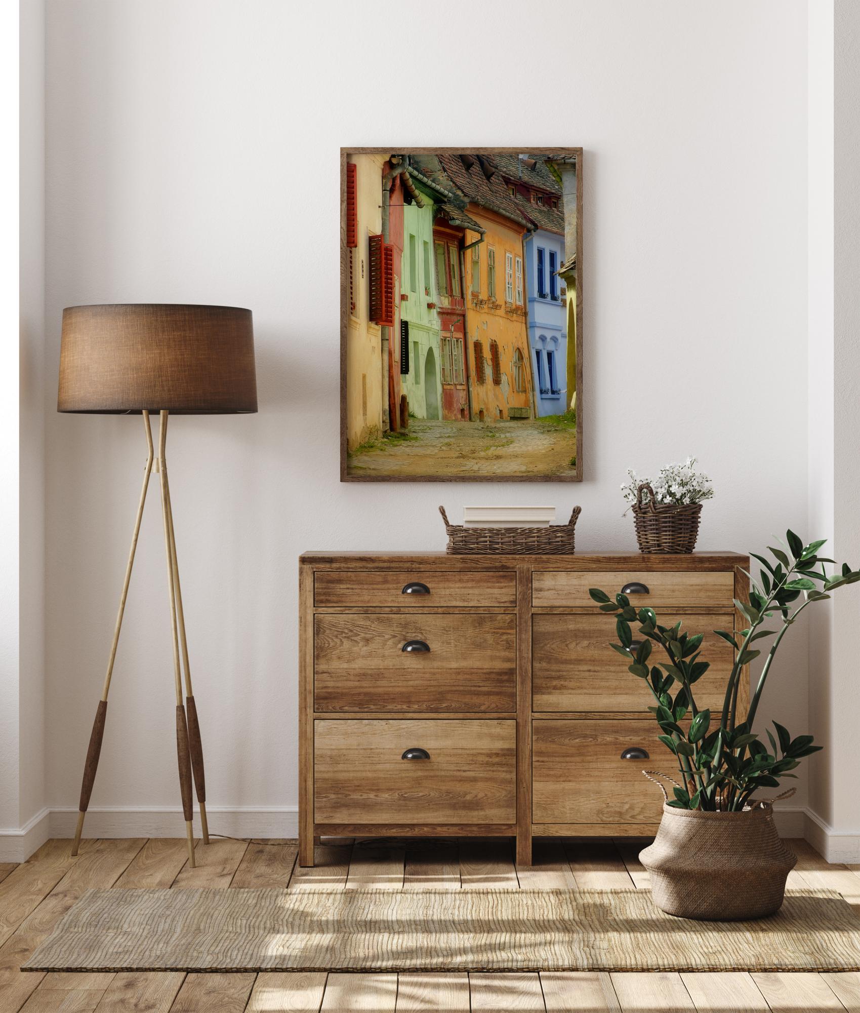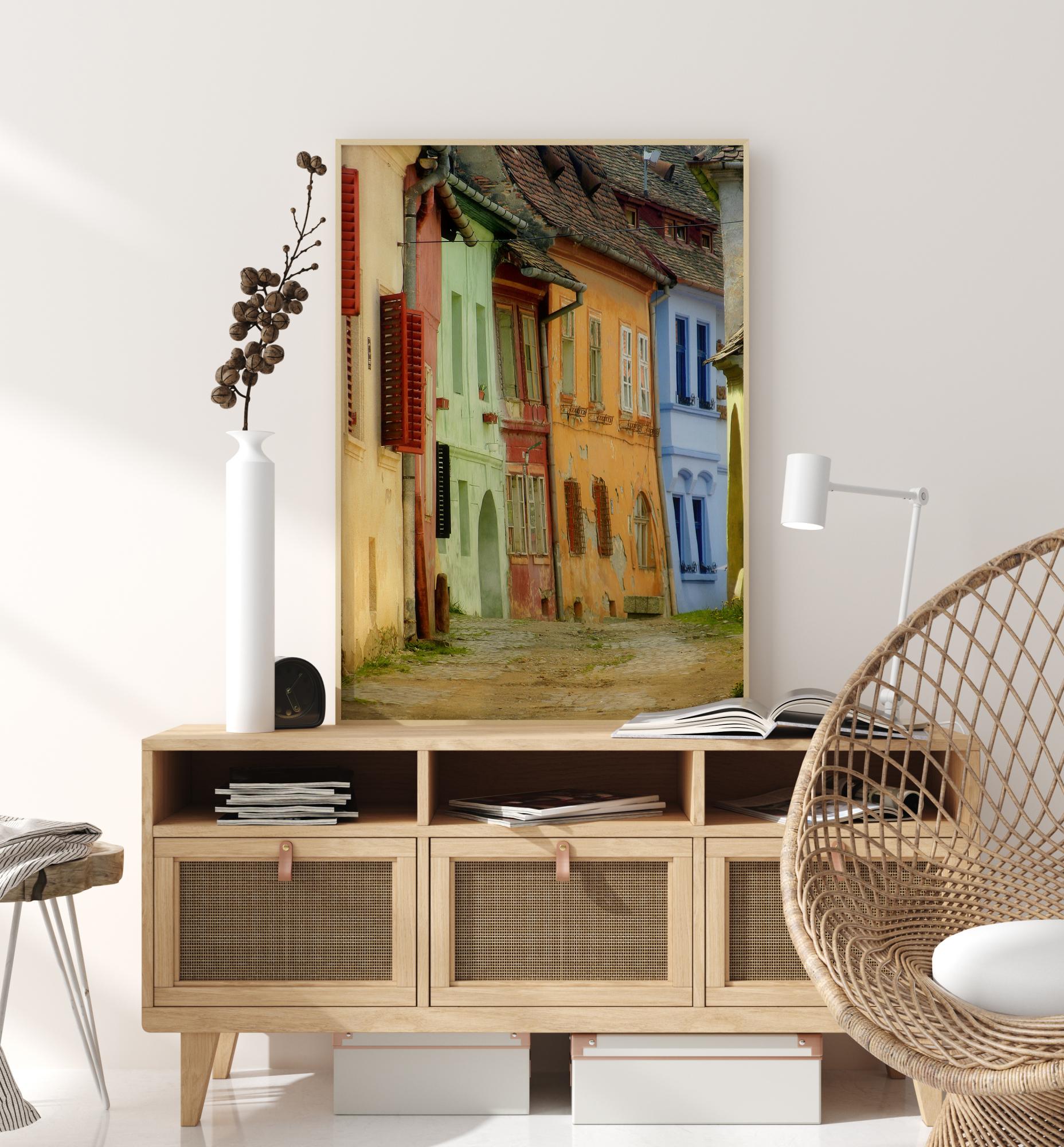 En pittoresk poster med gamla, men färgglada hus längs en smal gata. Kullerstensgatan leder mellan beigea, gröna, orangea och blå hus med tegeltak samt breda öppna röda fönsterluckor. Njut av den pittoreska, lugna atmosfären i denna charmiga pittoreska scen.