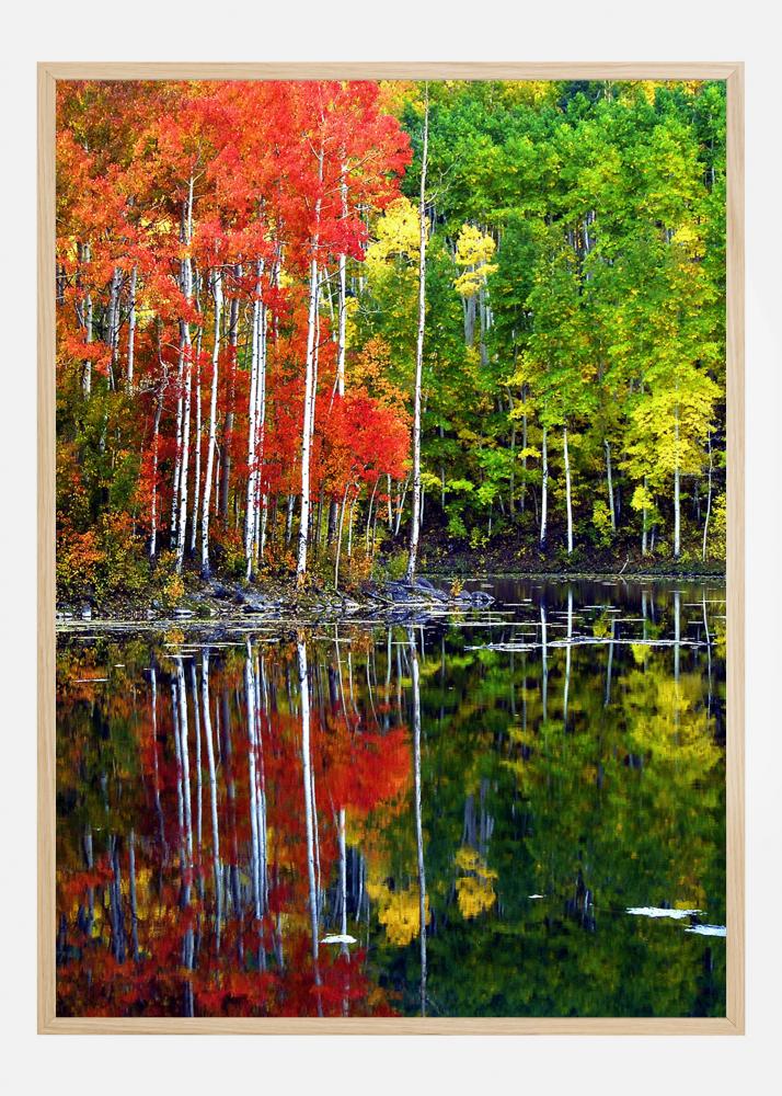 En ljus poster med en sjö omgiven av träd. Vår och höst möts i den här färgglada bilden med röda löv till vänster och grön till höger. Alla kastar en ljus reflektion mot sjöns vatten i en lugn men ändå färgstark scen. Ta med naturens glädje in i ditt hem med hjälp av den här utskriften.