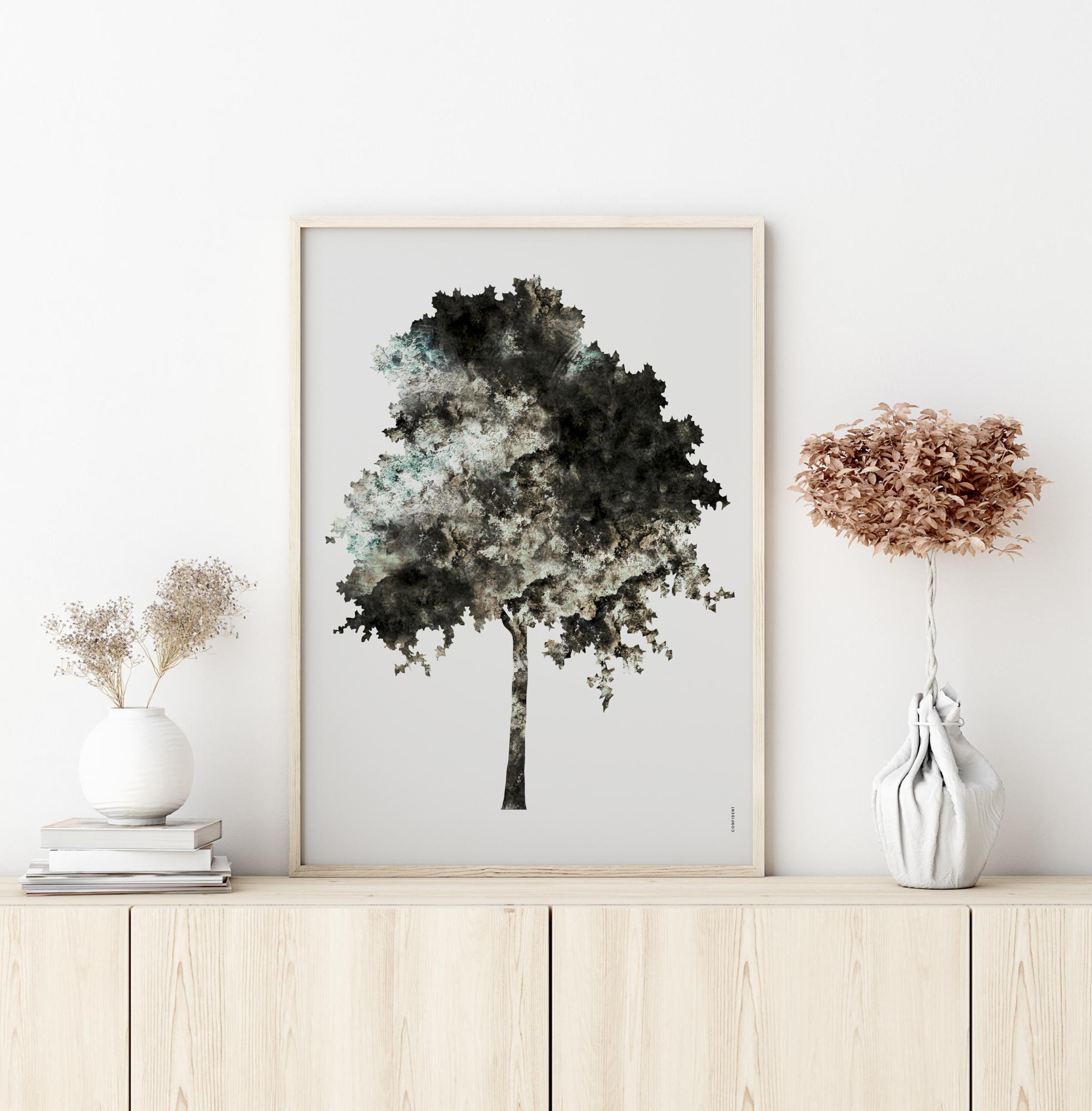 En grafisk konst poster i form av ett träd, skapad av den grafiska konstnären Isabell Larsson, VISSLA Visuell Design. En härligt minimalistisk tavla i harmoniska färger som passar lika bra i hallen eller köket som i vardagsrummet, sovrummet eller biblioteket.