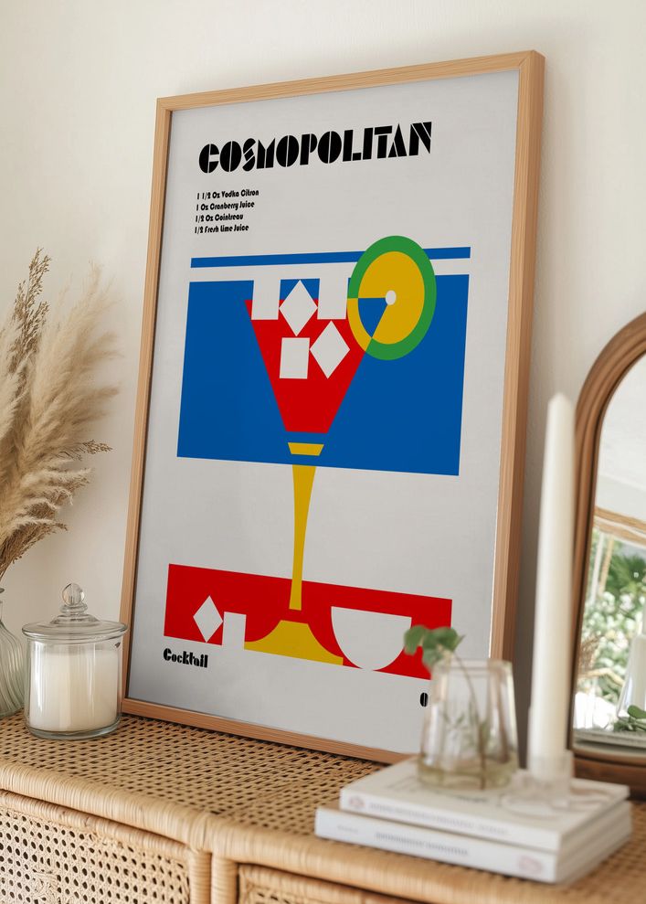 Affischens färgpalett består huvudsakligen av klara primärfärger; röd, gul och blå, med detaljer i vitt som ger en fräsch och ren look. Oavsett om du dekorerar en bar, ett kök eller ett vardagsrum, ger denna print ett elegant och konversationsframkallande tillägg till ditt utrymme. Perfekt för de som älskar både konst och cocktails, sätter denna affisch en sofistikerad twist på ditt interiör.