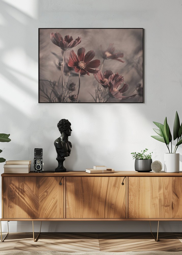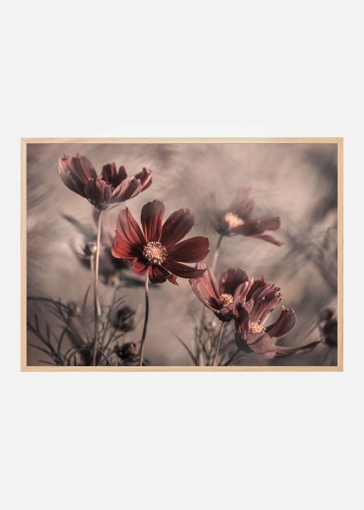 Färgpaletten i detta motiv domineras av rödbruna och lila nyanser, kompletterade av en neutralt grå bakgrund som verkligen framhäver blommornas detaljer. För den som söker en affisch med både liv och elegans, erbjuder detta verk en tidlös skönhet som är lätt att matcha med andra inredningsstilar. Låt denna print inspirera och skapa en fridfull atmosfär i ditt hem.