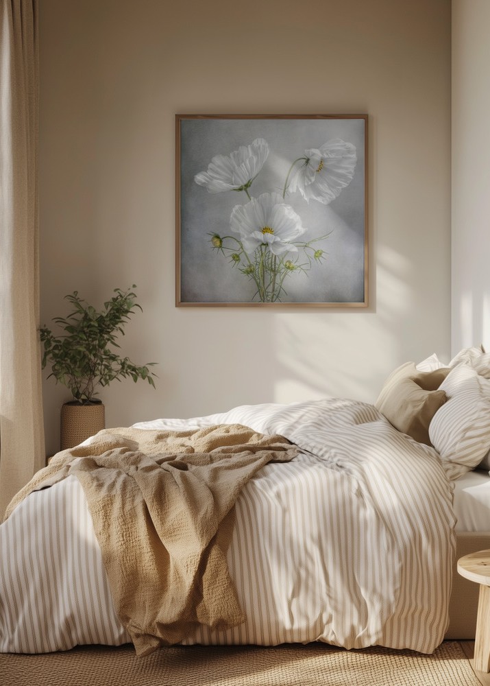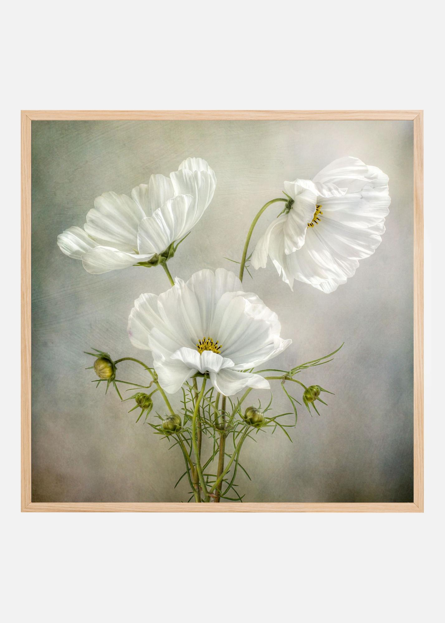 Denna poster fångar skönheten i tre eleganta blommor som sträcker sig mot ljuset med sina skira, vita kronblad. De utsökta detaljerna i varje blomblad framhävs mot en mjuk och drömlik bakgrund, som ger motivet en känsla av lugn och harmoni. Denna affisch är perfekt för att förmedla en känsla av enkelhet och elegans i alla rum.