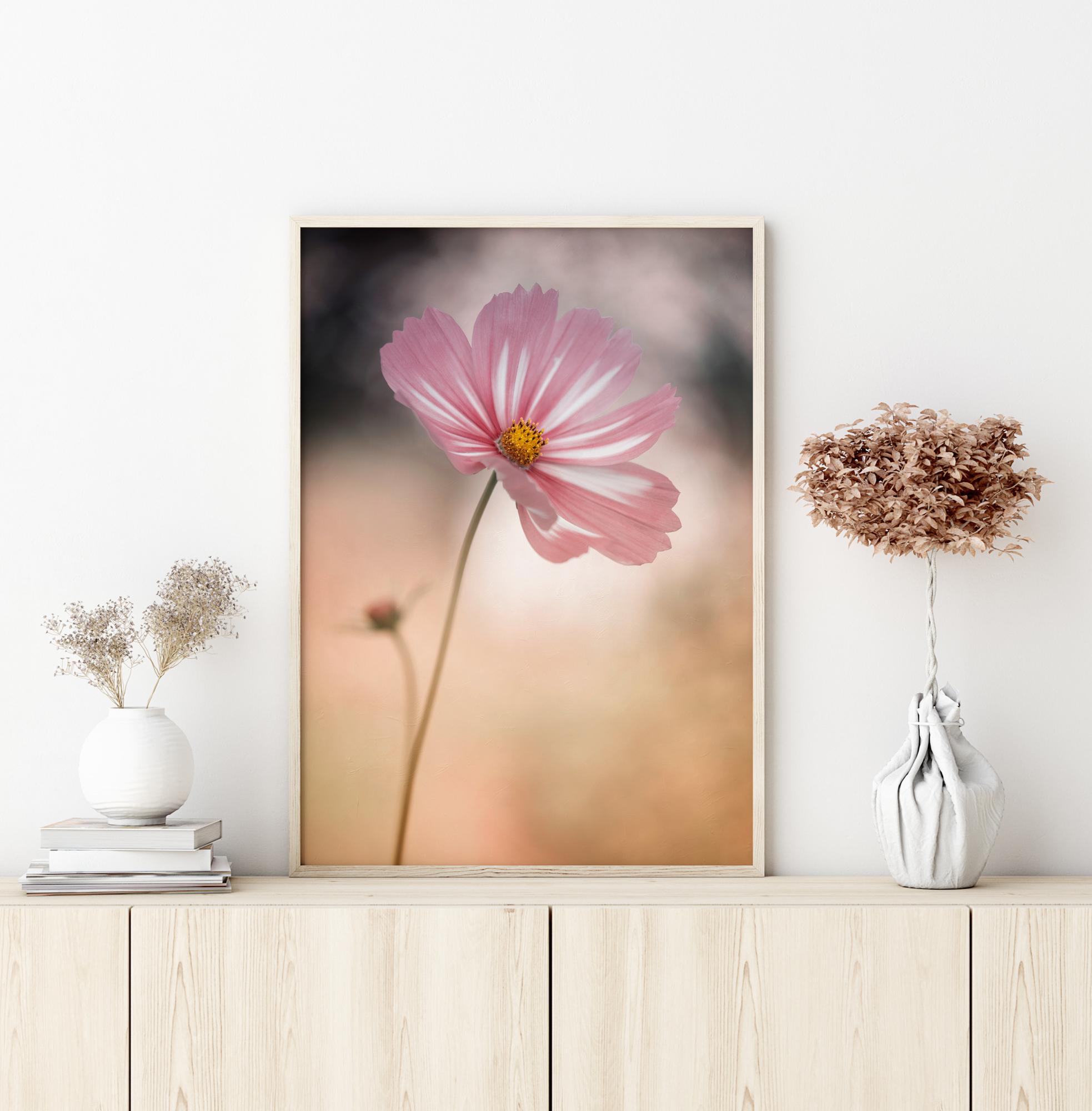 En fantastisk poster med en rosenskära med det ljus som skiner genom kronbladet. Kronbladets rosa och den gula mitten är ljusa med en persikofärgad bakgrund som ger djup. Känn ljus och fläkt när du tittar på den här mjuka pastellbilden hängande i ditt hem.
