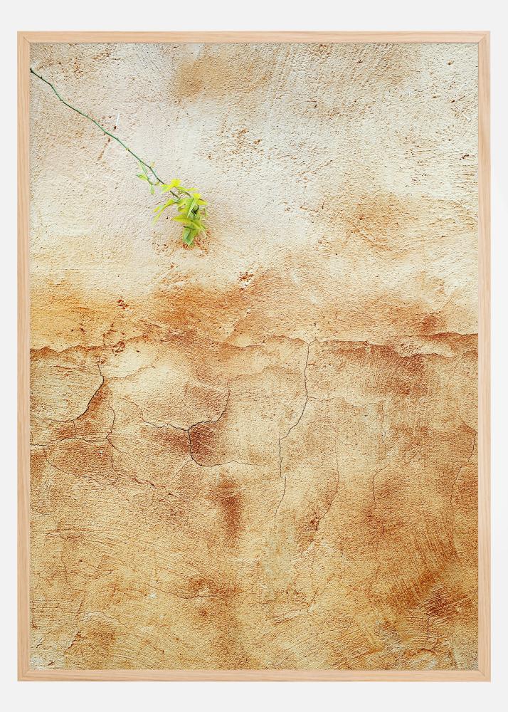 En närbildsposter med en krackelerad vägg med en liten ljusgrön växt som växer i sprickan. Den mjuka jordbruna väggen kompenseras av den tunna gröna sprickan och den ljusa växten. Låt blicken vandra tills den hittar alla de konstiga sprickorna i denna texturella yta. Matcha det här verket med en liknande färgad vägg för bästa effekt.