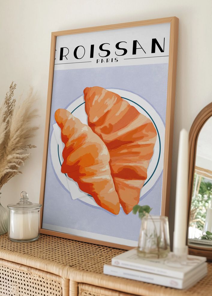 Denna eleganta poster fångar essensen av en fransk frukost med två vackert illustrerade croissanter som ligger på en tallrik. Med detaljerade penseldrag framhävs texturen och färgnyanserna i bakverken, vilket ger en autentisk och aptitlig känsla. Affischen är perfekt för den moderna köksinredningen eller som en stilfull detalj i ett café. Det enkla men iögonfallande motivet förmedlar känslan av Paris och fransk kultur, vilket gör den till ett utmärkt val för konstälskare.