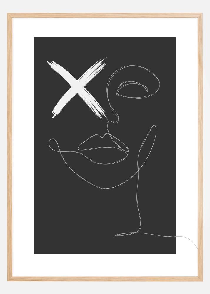 En abstrakt poster med ett ansikte ritat med tunna vita linjer mot en svart bakgrund. De vita linjerna är alla förenade för att skapa ansiktet i en jämn rörelse. Där ett öga borde vara sitter ett dramatiskt vitt kors. Vad betyder det? Häng upp detta verk centralt för en konstkonversation i hemmet.