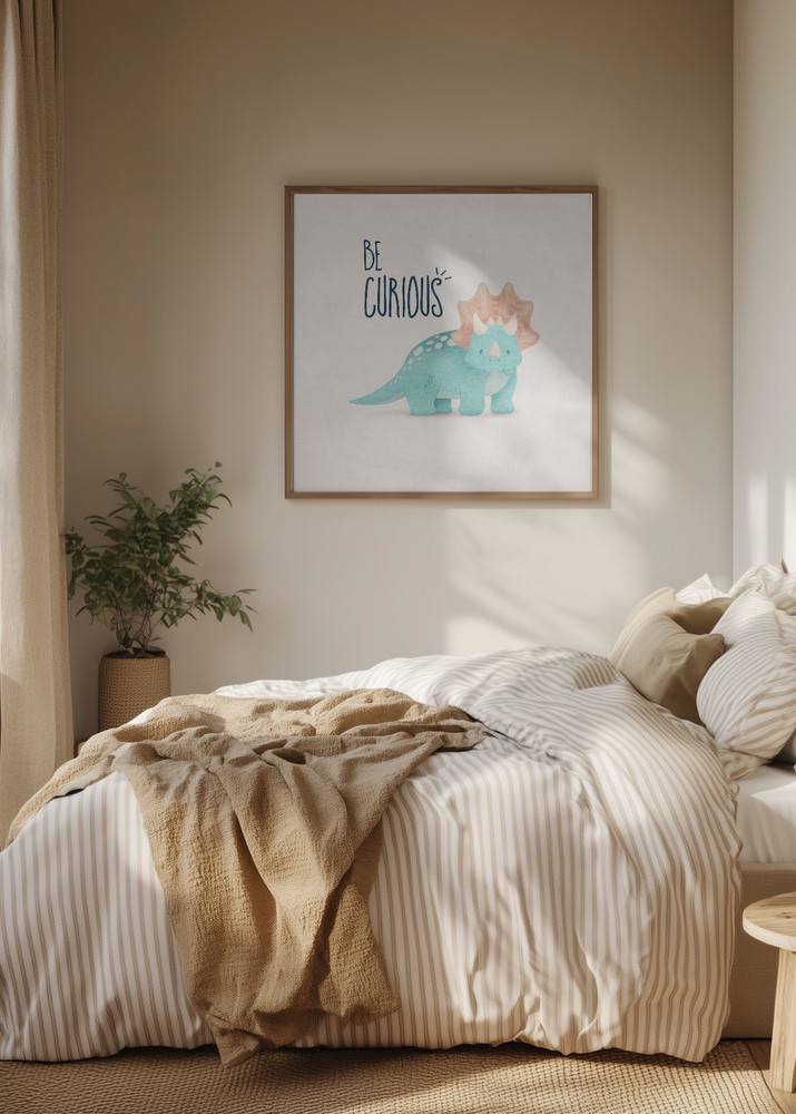 Denna charmiga poster föreställer en lekfull dinosaurie, perfekt för att inspirera nyfikenhet hos både unga och gamla. Texten "Be Curious" ger en upplyftande känsla, vilket gör den idealisk för barnrum, lekrum eller andra kreativa miljöer. Det är en print som uppmuntrar fantasi och utforskning, vilket gör den till ett utmärkt val för att liva upp vilket rum som helst.