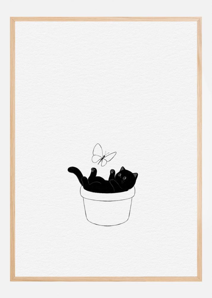 I affischen dominerar mjuka nyanser av svart och vitt, vilket gör den mångsidig och lätt att matcha med olika interiörstilar. Den svarta figuren av katten ger en stark visuell effekt mot den vita bakgrunden, och kontrasten är så tilltalande att den gör sig utmärkt si både moderna och traditionella miljöer. Denna print är en diskret men ändå fängslande väggdekor som kommer att uppskattas av kattägare och designentusiaster.
