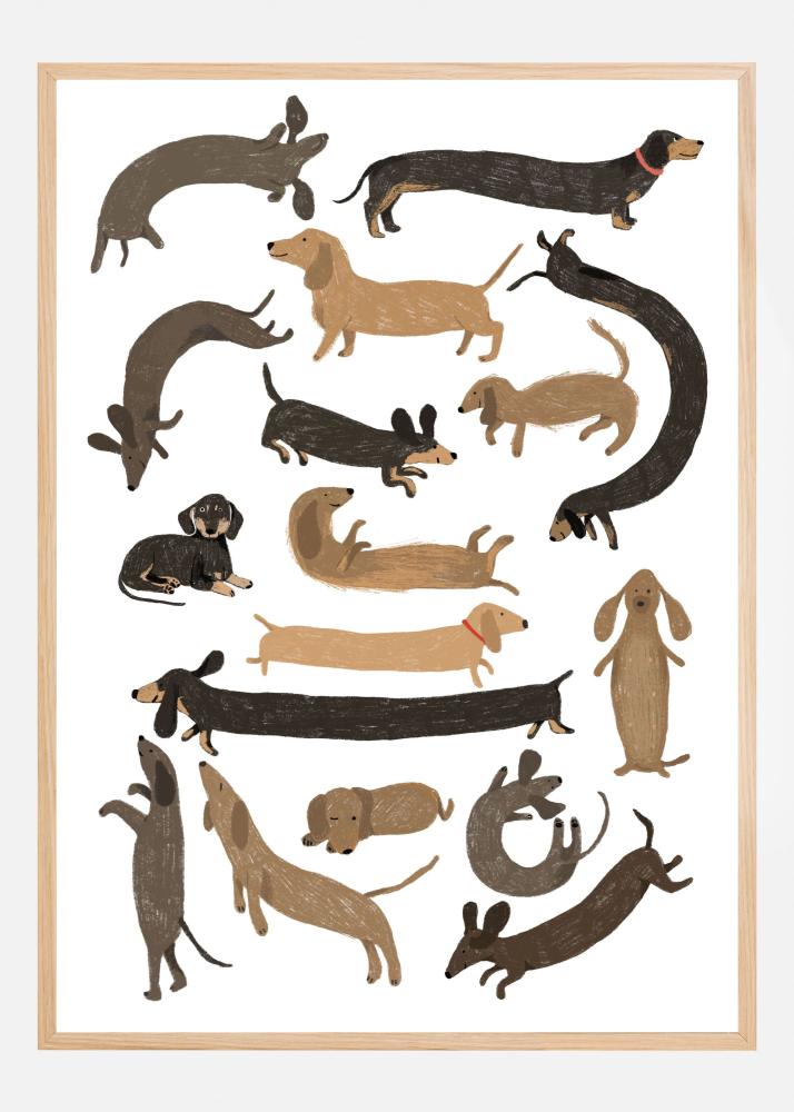 Denna charmiga och lekfulla poster föreställer ett urval av hundar i varierande stilar och positioner, vilket skapar en dynamisk och rolig atmosfär i vilket rum som helst. Med en samling av taxar i olika storlekar och färger kommer denna print att appellera till hundälskare och ge en vänlig och välkomnande känsla till din väggkonst. Hundarnas skisser är utförda i en enkel och stiliserad form, vilket ger affischen ett modernt och trendigt uttryck.