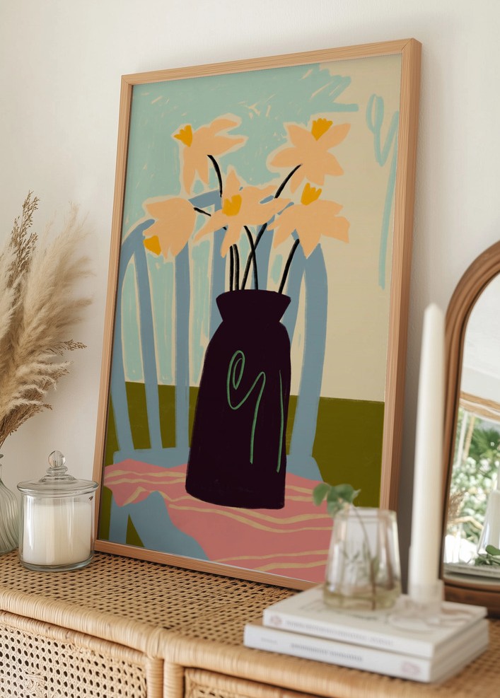 Denna poster fångar ögat med sitt charmiga motiv av blommor i en enkel vas, vars formspråk ger en modern känsla. Affischen visar en bukett av gula blommor med mjuka orange nyanser, vilket ger en varm och inbjudande atmosfär. Vasen är placerad på en stol, vilket tillför en intressant dimension och djup till motivet. Genom sin stilrena och konstnärliga touch blir denna print ett perfekt tillskott för att lysa upp ditt hem eller kontor.