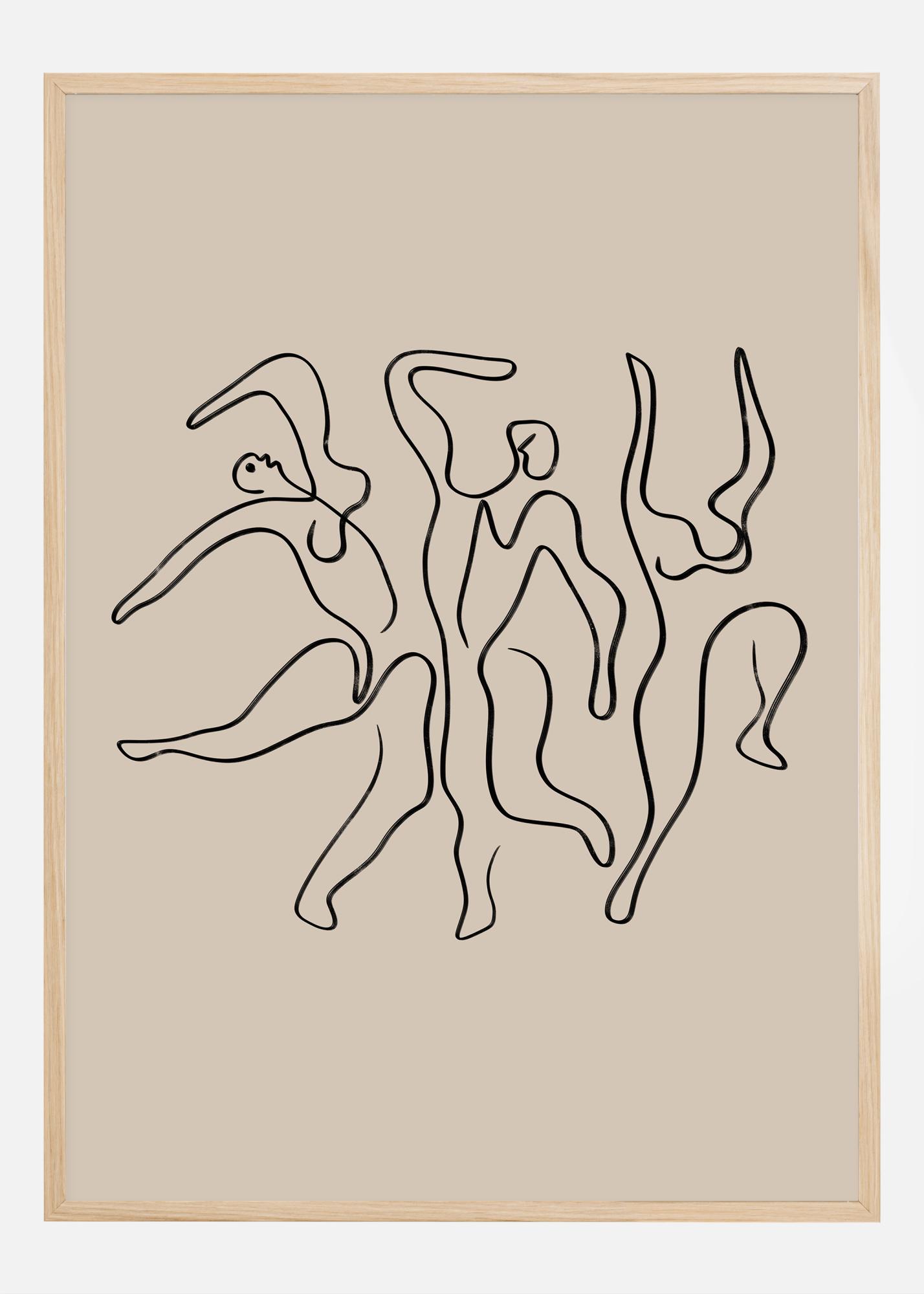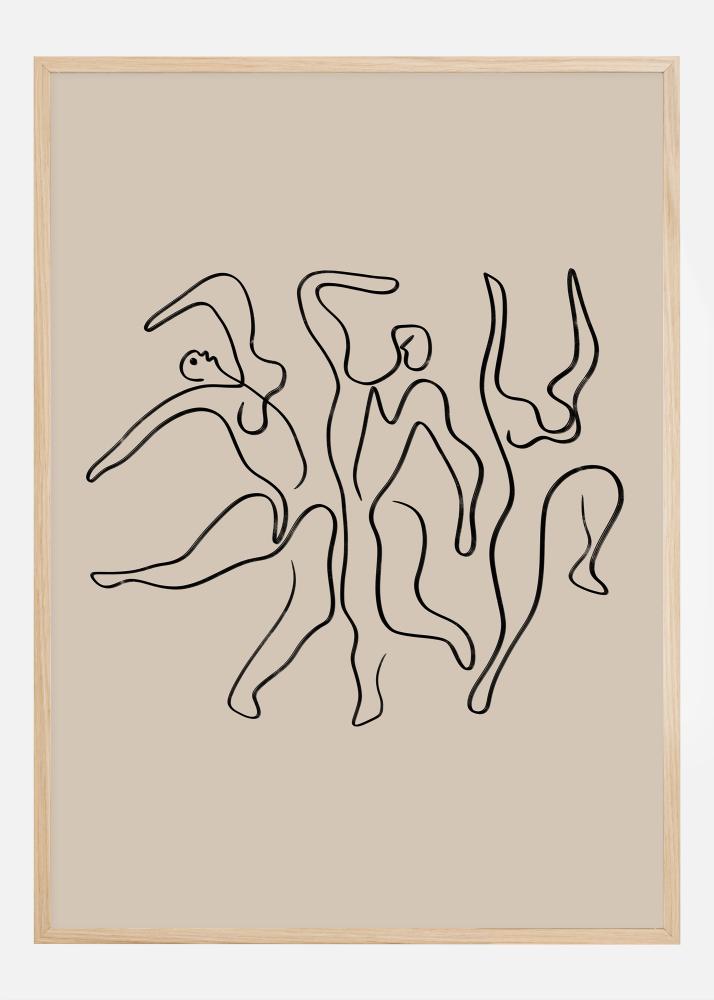 Denna konstnärliga affisch presenterar en serie abstrakta figurer som genom sina flödande linjer framställer en känsla av rörelse och dans. Den enkla men uttrycksfulla illustrationen i svart mot en lugn beige bakgrund erbjuder ett minimalistiskt men levande uttryck. Den här typen av motiv är perfekt för dem som uppskattar subtila men kraftfulla konstverk som inspirerar till rörelse och frihet.