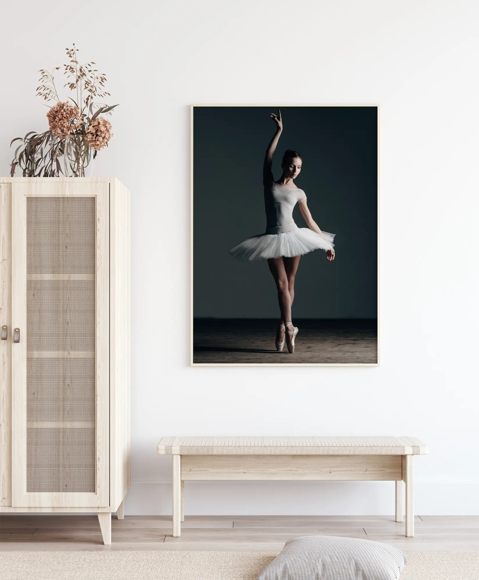 En fotografisk poster av en graciös balettdansös ståendes på tå med ena armen uppsträckt över huvudet. Ljussättningen i bilden gör att hennes ansikte och vita kläder kontrasteras fint mot den lite mörkare omgivningen
