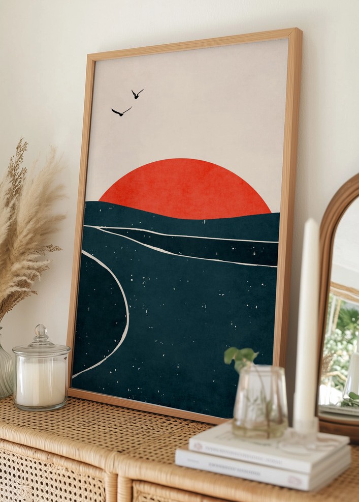 Denna stilrena poster fångar ögonblicket av en solnedgång, där en intensivt röd sol sänker sig bakom mörka havsvågor. Solens fylliga färg skapar en slående kontrast mot de djupa blå nyanserna i vattnet, vilket ger motivet en modern och uttrycksfull känsla. Fåglar som svävar över horisonten tillför en känsla av rörelse och frihet, vilket gör denna print till en perfekt dekoration för moderna hem.