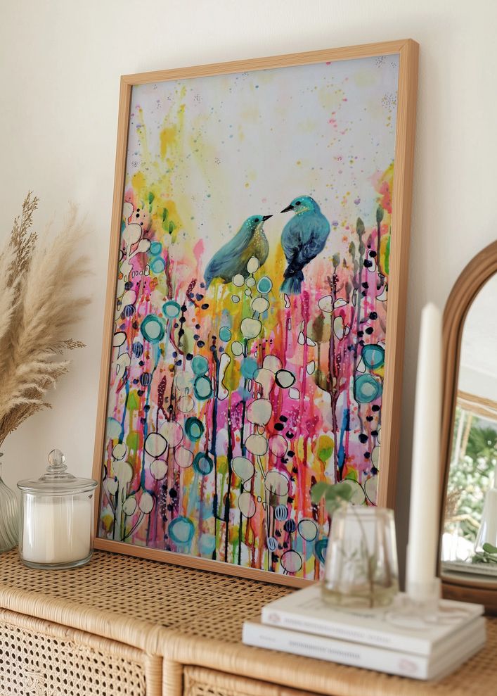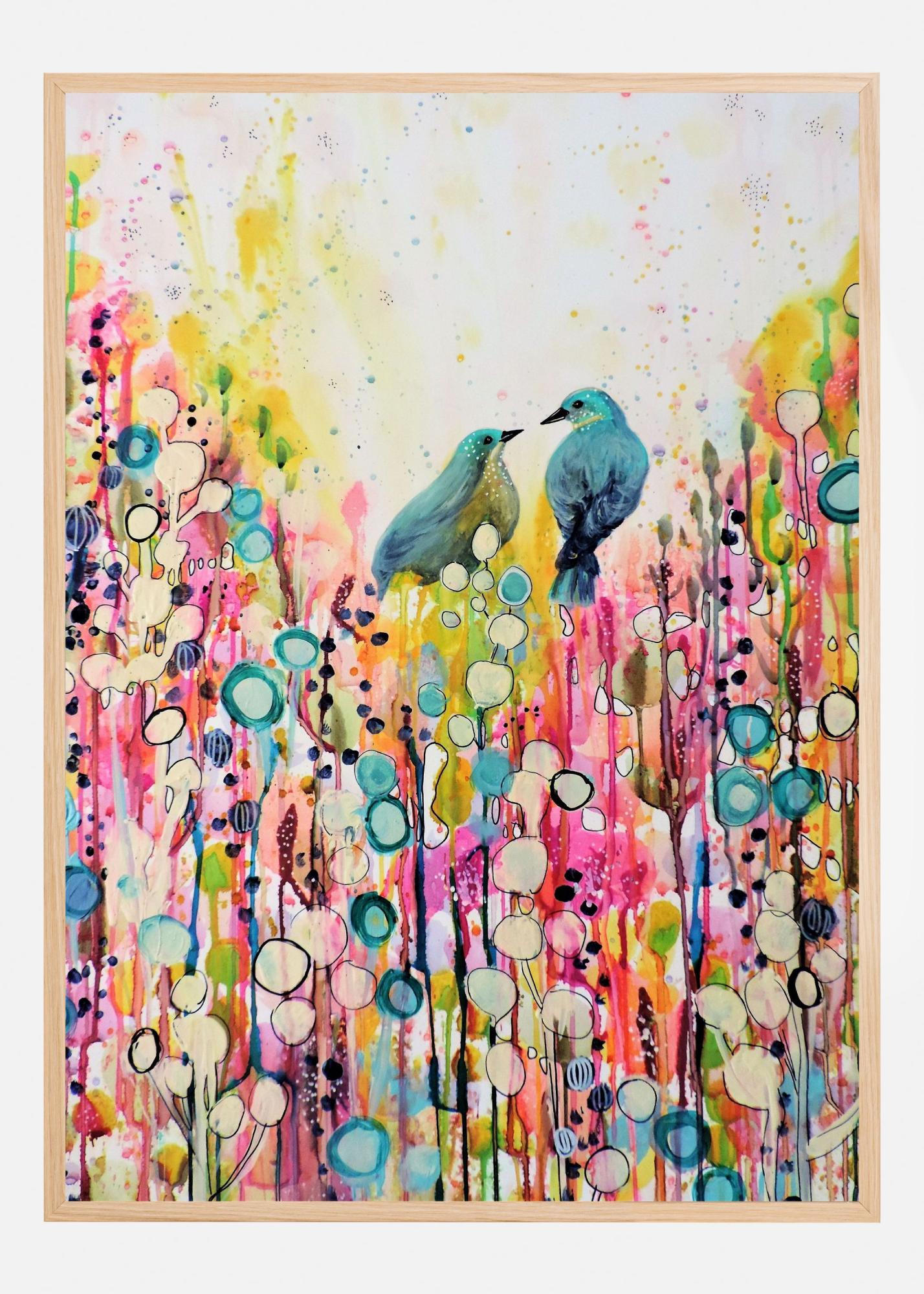 Denna livfulla poster fångar två fåglar som verkar ha en tyst konversation mitt i ett hav av blommor. Det abstrakta landskapet är fyllt av dynamiska former och färger som ger en känsla av rörelse och energi. Färgpaletten är en explosion av levande nyanser som rosa, gult, grönt och blått, vilket skapar en harmonisk men ändå intensiv visuell upplevelse. Denna print är perfekt för alla rum där du vill lägga till en färgsprakande och konstnärlig touch.
