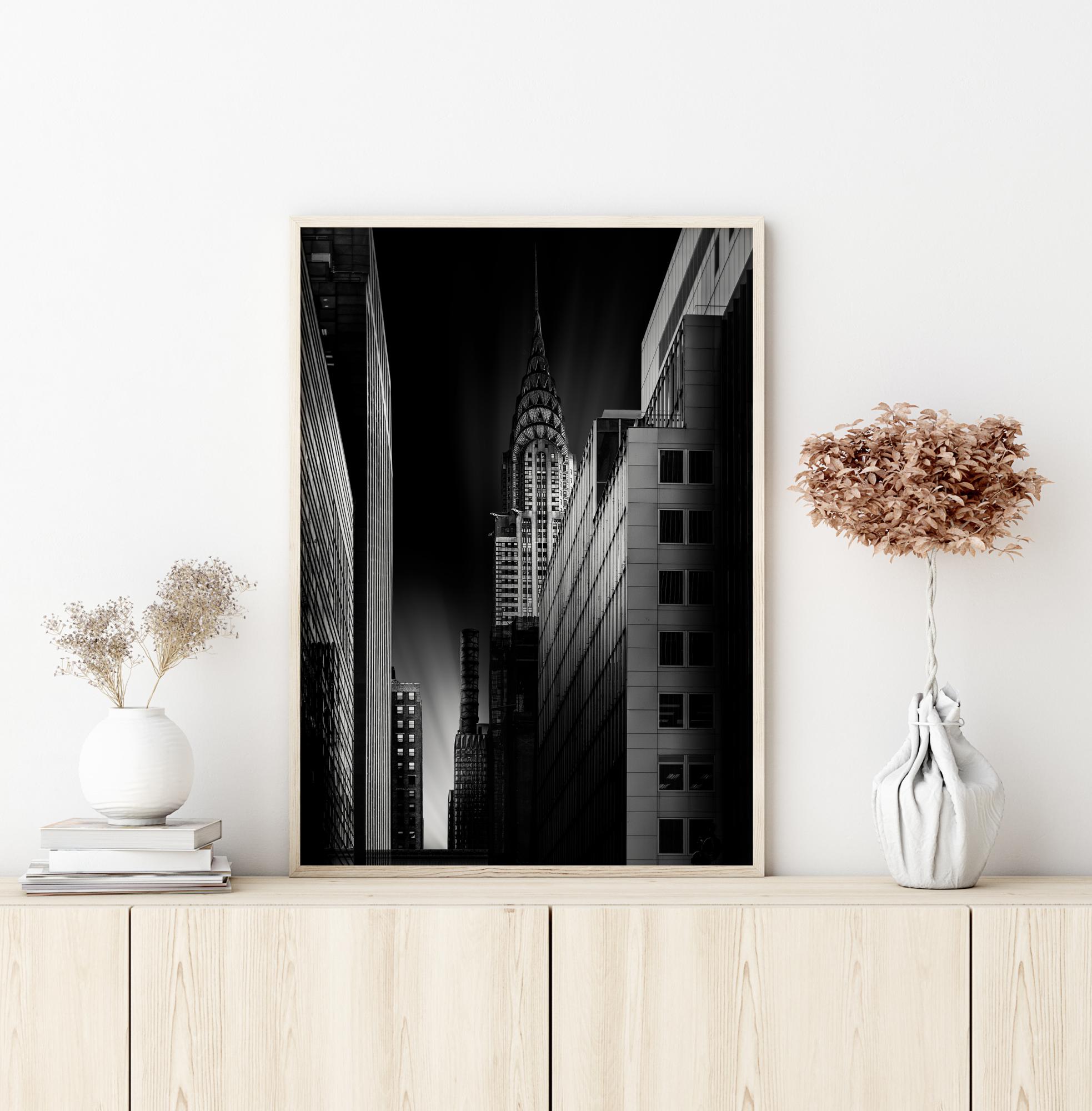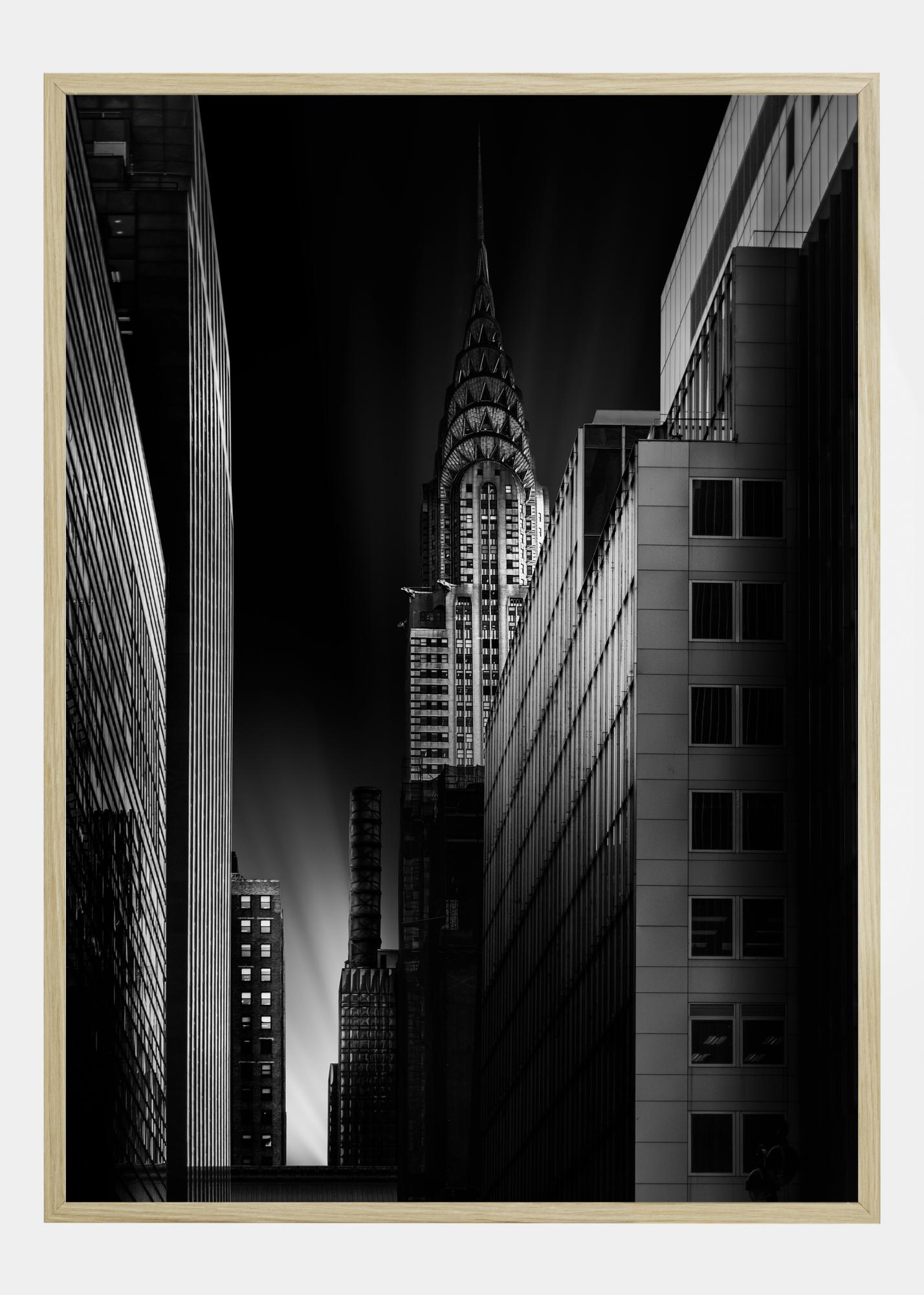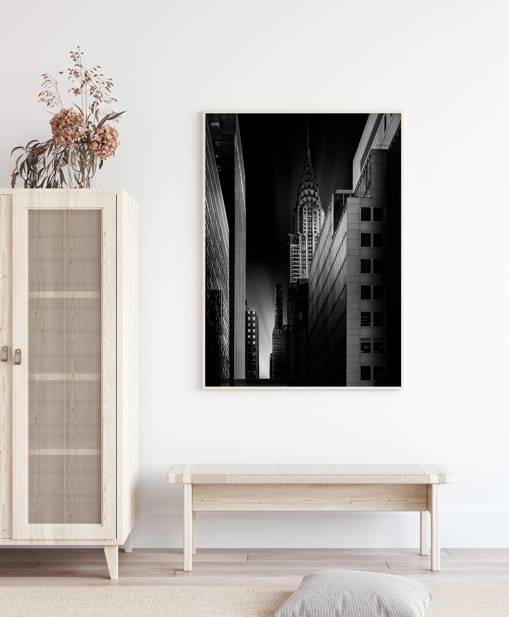 En urban poster med Chrysler-byggnaden på natten. En smal gata leder blicken ner till en ljusblixt på himlen. Till höger kan den skuggiga byggnaden ses i detta något kusliga foto. Hängbilden på en vit vägg i ett privat galleri.