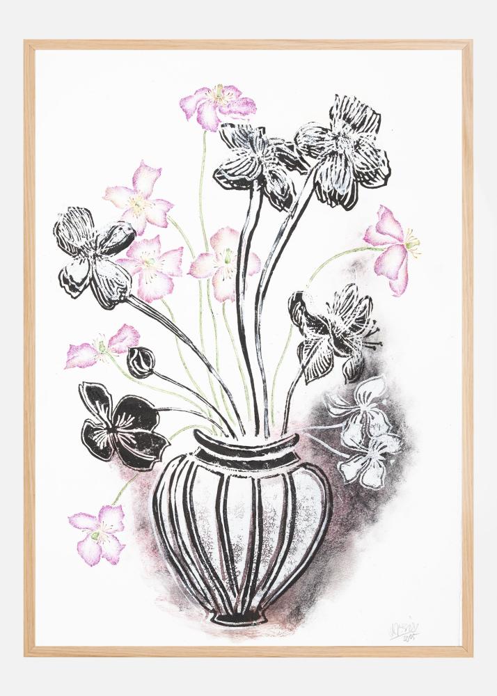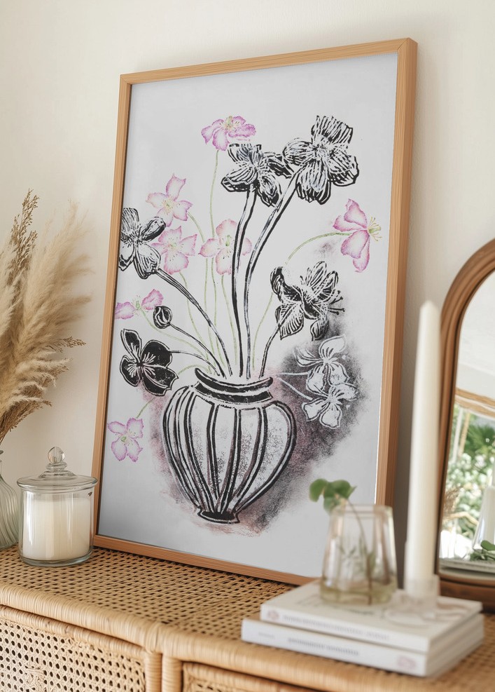 Färgerna i motivet inkluderar svarta linjer och detaljer, tillsammans med subtila rosa och lila nyanser som pryder blommorna. Denna print är perfekt för att ge en stilfull och sofistikerad touch till vilket rum som helst, och fungerar utmärkt både ensam och i kombination med andra trendiga posters för att skapa en inspirerande vägg. Affischen fångar både ett tidlöst och modernt uttryck, vilket gör den till ett utmärkt val för dem som vill lyfta in naturens skönhet i sitt hem.