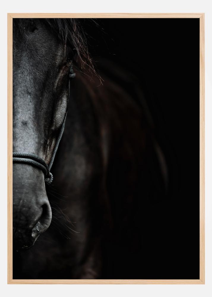 En fotografisk poster för hästälskaren! Här är en mörk häst fotad rakt framifrån mot en mörk fond. Ansiktet är vackert upplyst medan hästens bakre delar smälter in i bakgrunden. Komplettera gärna med något ur vårt stora sortiment av ramar.