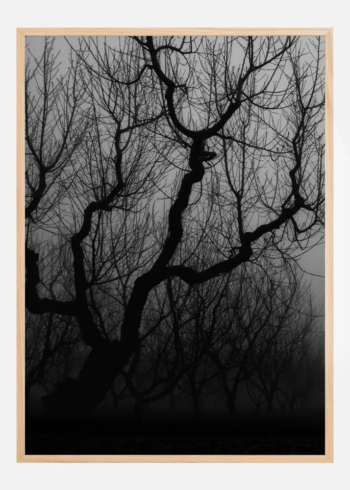 En kuslig poster med ett mörkt vridet träd i natten. De pinade trädstammen vrider sig upp från vänster i bilden, de tjocka grenarna knyter sig mot en dyster grå himmel. I bakgrunden finns ett antal mörka trassliga buskar och grenar. Häng den här bilden på en mörk vägg för en riktigt stämningsfull, men ändå spännande atmosfär.