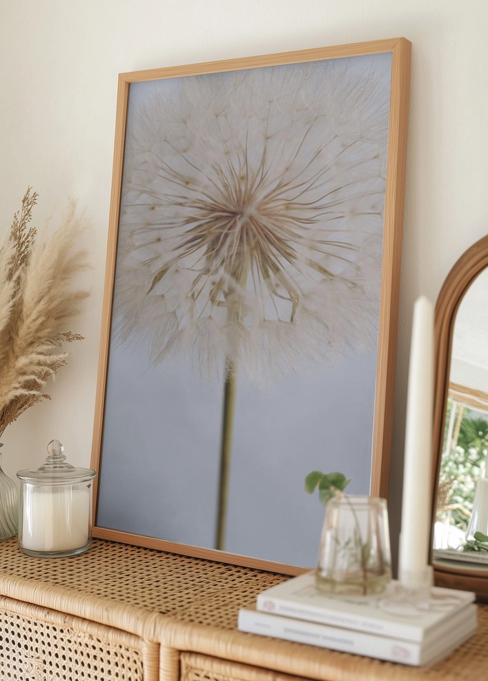 Motivet domineras av krämiga vita och beige toner från maskrosens frön, med en mild övergång till den gröna stjälken. Bakgrundens ljusblå nyans förstärker känslan av friskhet och frihet. Denna print är ett utmärkt val för att skapa en mjuk och naturlig atmosfär i ditt hem eller kontor.
