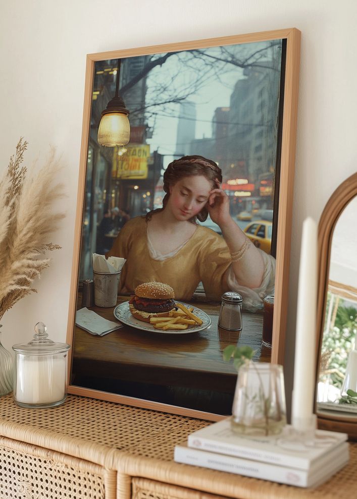 Färgpaletten i denna print domineras av mjuka och dämpade bruna och gula nyanser, med inslag av varm belysning och kalla stålgrå färger från staden. Den pågående scenen med hamburgaren och pommes frites på bordet ger en modern touch till affischen och kompletterar känslan av att gamla världar möter nya. Denna affisch är perfekt för att lägga till en touch av sofistikation och modernitet till ditt hem.