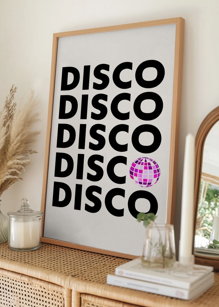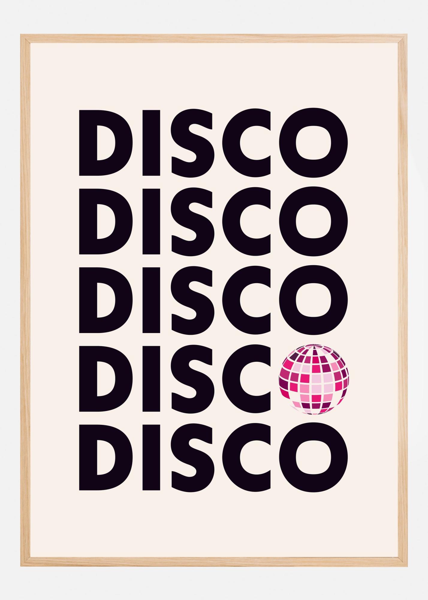 Denna trendiga poster bringar en retro-känsla med sitt stilrena motiv. Ordet "DISCO" upprepas i djärva, svarta bokstäver, vilket påminner om den energiska atmosfären från disco-eran. En rosa och vit discokula bryter mönstret och ger en fräsch twist, vilket gör denna affisch till en perfekt inredningsdetalj för den som älskar musik och dans. Den minimalistiska framtoningen gör det enkelt att kombinera denna print med andra konstverk i ditt hem.