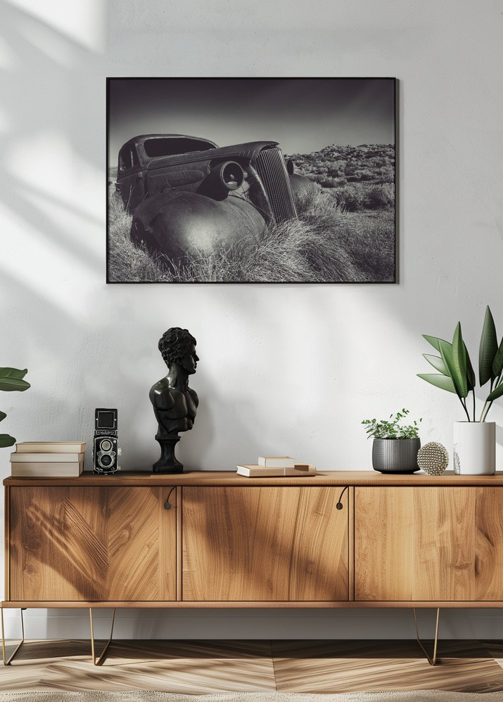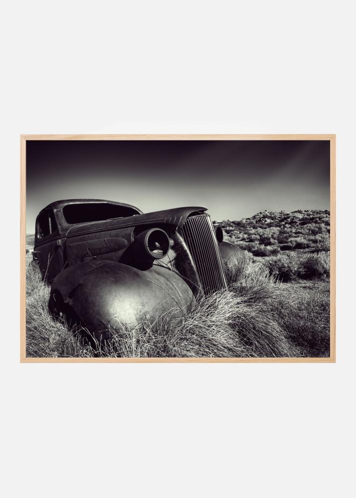 Denna poster föreställer ett charmigt och nostalgiskt motiv av en gammal bil som har sett bättre dagar, placerad mitt i ett vidsträckt ökenlandskap. Den rostiga bilen och den övergivna miljön förmedlar en känsla av historisk mystik och förlorad tid, perfekt för den som söker en nostalgisk och unik inredningsdetalj. Printen framhäver bilens kurvor och detaljer, vilket gör den till ett blickfång i varje rum.