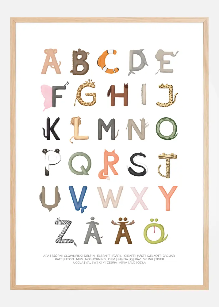Denna lekfulla och pedagogiska poster är perfekt för att inspirera nyfikenhet och lärande hos barn. Den visar alfabetet representerat genom en rad olika djur, varje bokstav unikt formad för att avbilda ett djur som börjar på just den bokstaven. Från 'A' som en apa till 'Ö' som en ödla, varje karaktär är rikt illustrerad med en tydlig, vänlig och färgglad stil. Den innehåller även de tre extra bokstäverna i det svenska alfabetet: 'Å', 'Ä' och 'Ö', vilket ger en komplett språklig upplevelse.