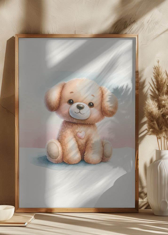 Tillför en gnutta värme och lekfullhet till vilket rum som helst med denna bedårande poster som framställer en kramvänlig tecknad nallebjörnsfigur. Detta motiv är perfekt för barnrummet eller som en söt touch i en mysig läshörna. Med dess mjuka pastelltoner av rosa, beige, och vita nyanser, lägger denna print till en subtil färgpalett som passar väl i ett hem med skandinavisk eller minimalistisk stil.