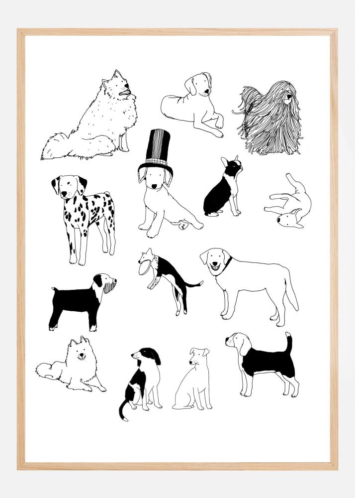 Skäm bort dina väggar med denna charmiga och stilrena poster som är ett sant paradis för hundälskare. Motivet presenterar ett urval av hundar i olika former och storlekar, från små lurviga kompanjoner till ståtliga och eleganta raser. Varje hund är tecknad med ett minimalistiskt och konstnärligt anslag som fångar djurens karaktäristiska drag. Den rena och enkla designen gör denna print till ett perfekt tillskott i alla rum, oavsett om det är i ett lekfullt barnrum eller en sofistikerad vardagsmiljö.