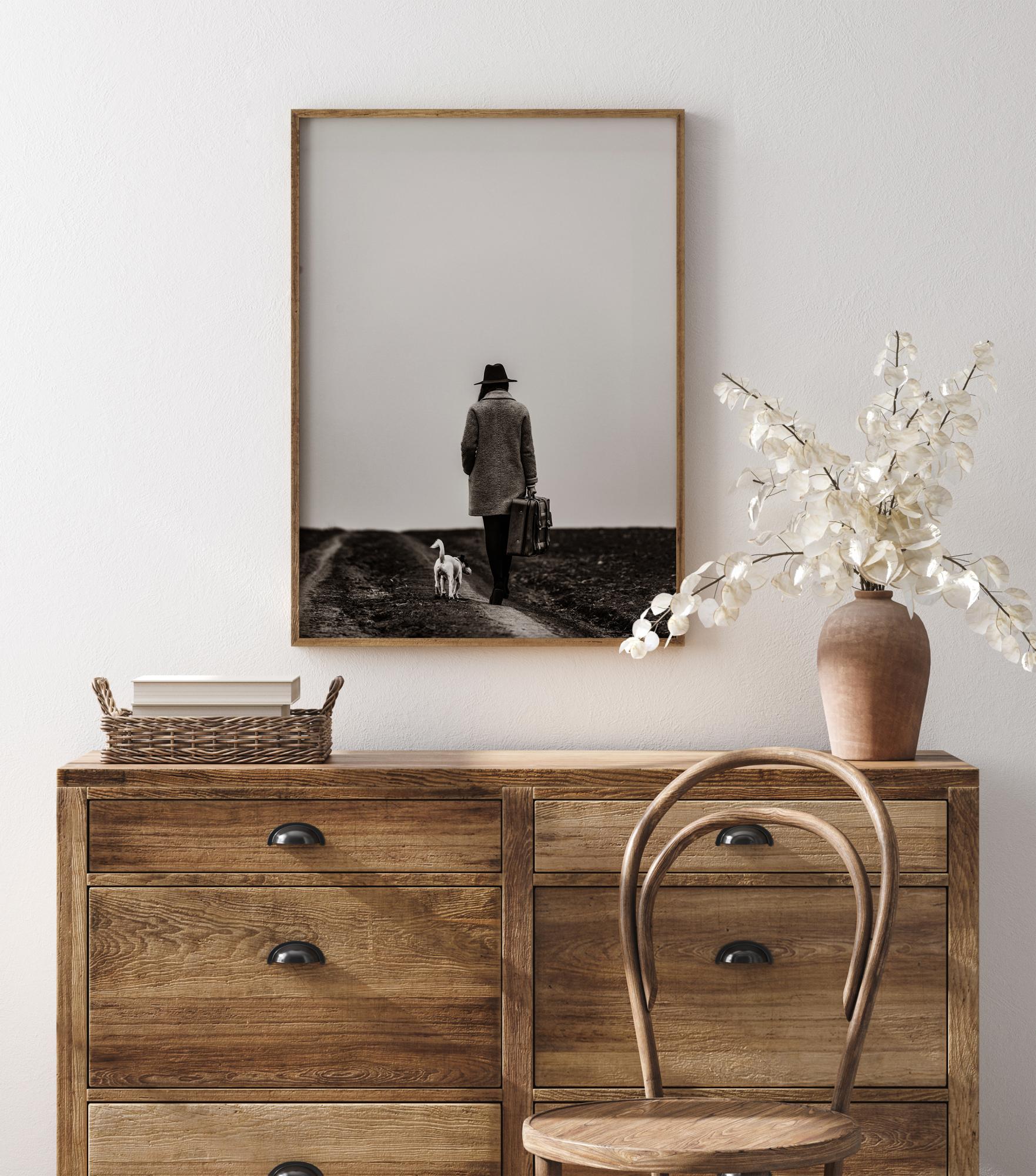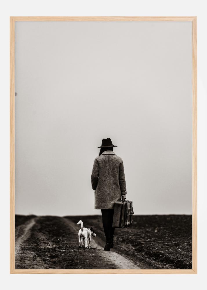 En minimalistisk poster av en kvinna som går längs en väg med sin hund. De två körfälten leder in i fjärran, kvinnan som bär en lång jacka samt en resväska och hennes terrier går bredvid henne. Den breda ljusa himlen är inbjudande. Följ med i den här kvinnan på hennes resor när den här svartvita bilden hänger på din vägg.