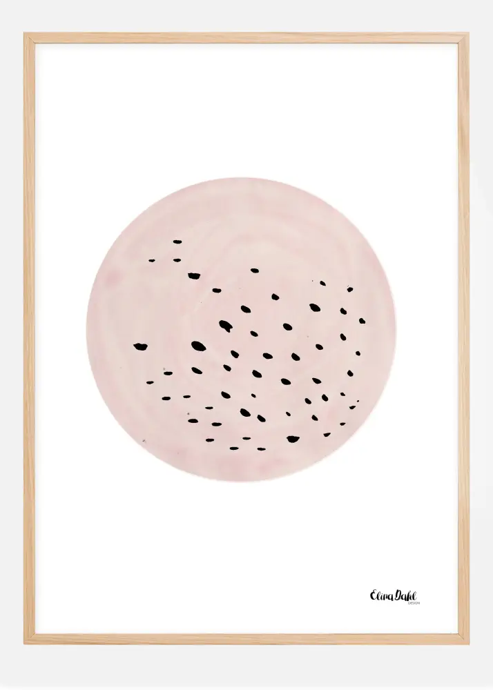 En abstrakt poster med svarta prickar i en beige-rosa cirkel. Denna cirkel är fylld med små prickar på ytan. Bollen är placerad på en vit bakgrund. Matcha denna underliga, men övertygande bild, med en stark djärv bakgrund för att skapa en riktigt intressant konstinstallation.