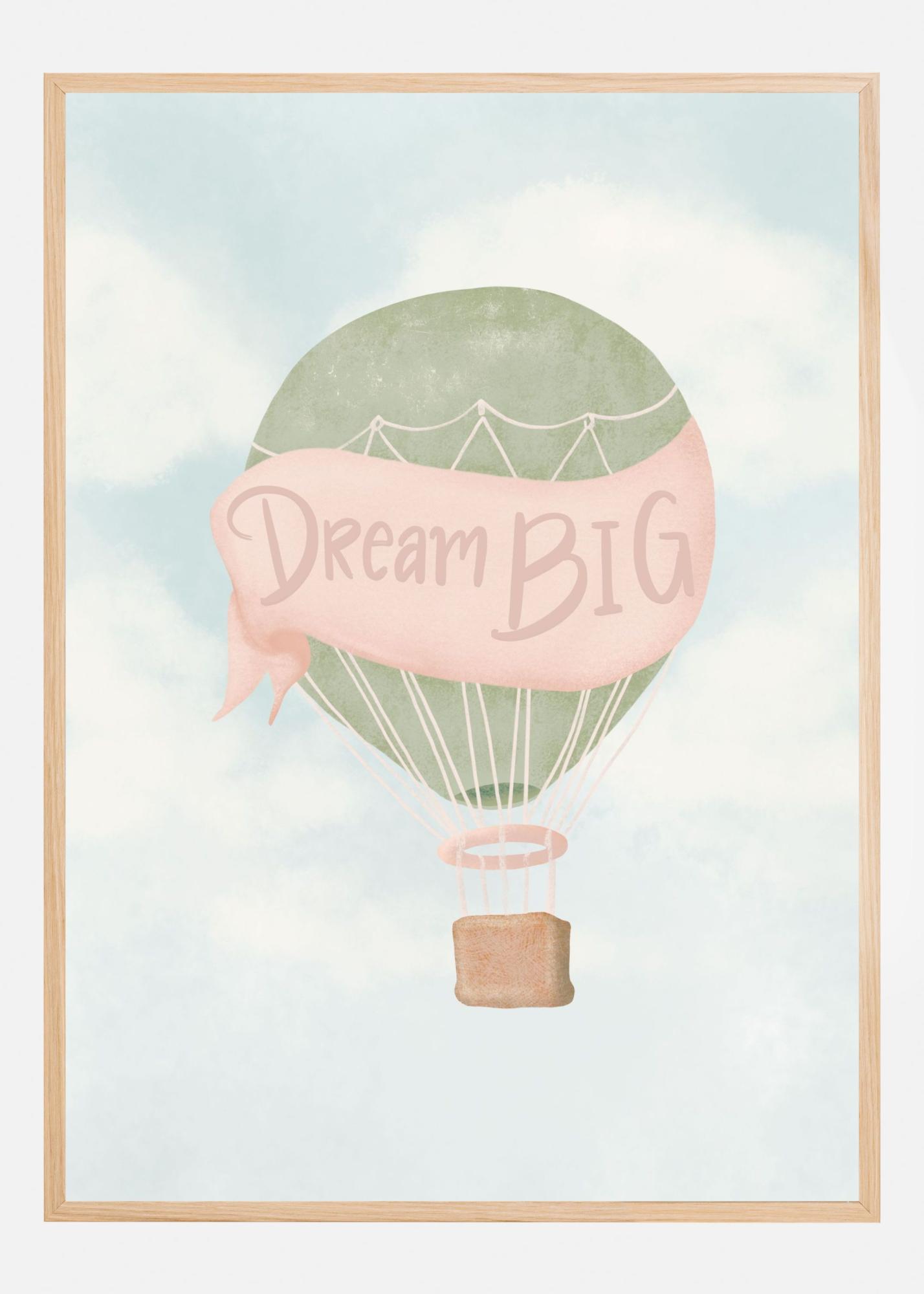 Denna poetiska och inspirerande poster, som framhäver texten "Dream BIG" på en pastellfärgad luftballong, passar perfekt för att sprida ett positivt och upplyftande budskap i ditt hem eller kontor. De lugnande jordnära tonerna av grönt, rosa och beige, tillsammans med en skir himmelsblå bakgrund, skapar en harmonisk och drömlik färgpalett som bidrar till en avslappnad och hoppfull atmosfär i rummet.