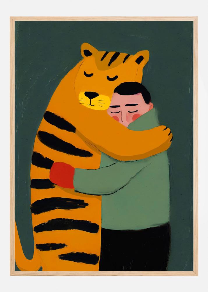 Denna charmiga och hjärtvärmande affisch föreställer en kärleksfull omfamning mellan en person och en stor tiger. Den visar en stark och känslig representation av vänskap och trygghet mellan människa och djur. Illustrationens enkla, men uttrycksfulla stil med sina stiliserade figurer bidrar till en modern och trendig känsla, perfekt för en samtida inredning.