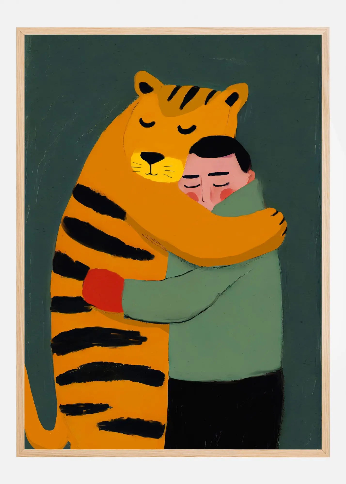 Motivet domineras av mjuka och jordnära färger; den lugna gröna tonen på personens tröja kompletteras av den varma orange färgen på tigern, vars svarta ränder ger en distinkt kontrast och dynamik till den annars stillsamma paletten. Motiven inramas av en djup, mattsvart bakgrund som får de andra färgerna att framstå som ännu mer levande och gör sig utmärkt som en omtänksam och konstnärlig poster i hemmet eller kontoret.