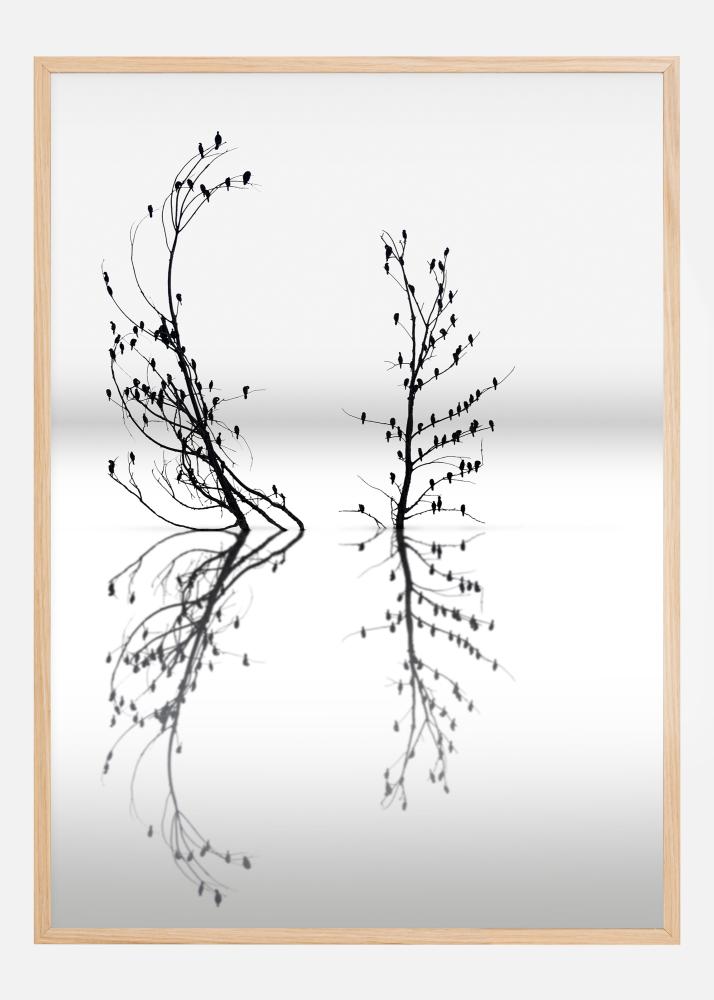 En stiliserad poster med två grenar som sticker upp ur vattnet. De mörka grenarna som är böjda och vridna kastar sina reflektioner mot det stilla vattnet nedanför. De dämpade blå och vita nyanserna i det här verket ger en lugn atmosfär som du kan njuta av när du har den här bilden på väggen i hemmet.