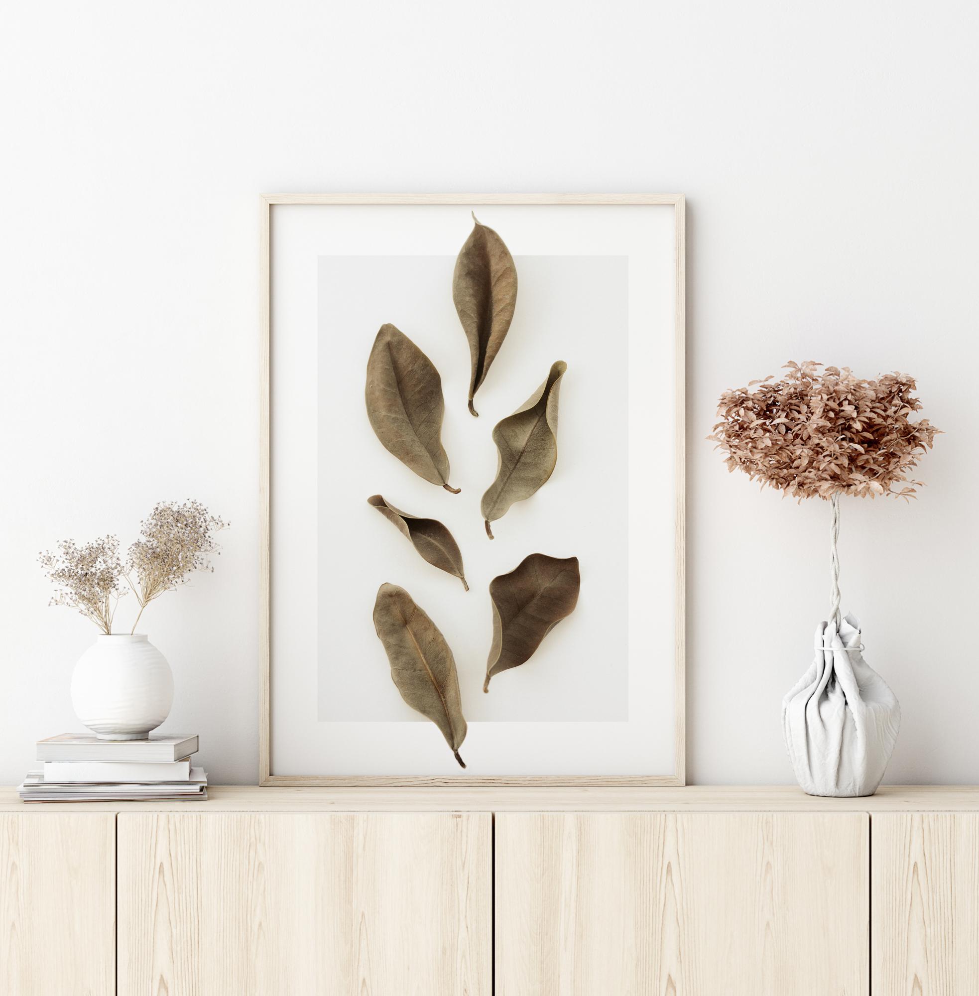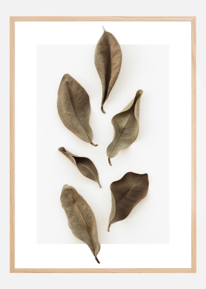 En detaljerad poster med torkade löv. Sex torkade löv är ordnade som om de fortfarande sitter på en gren mot en vit bakgrund. De bruna bladen är enkla och vanliga, perfekta för att förstärka en livfull vägg eller lägga till mönster till en enkel.