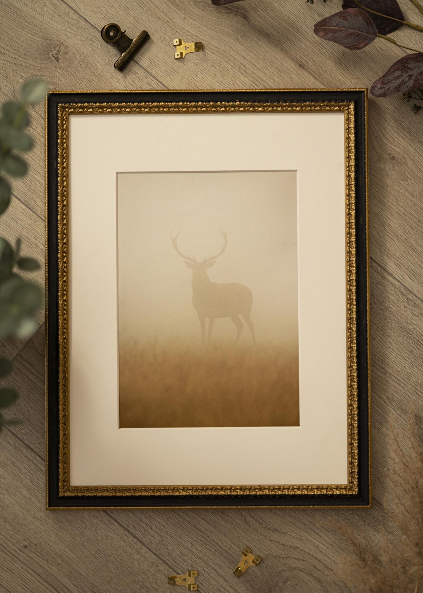 Ramen har en 25 mm bred ramlist och ett djup på 17 mm, vilket ger den en robust och gedigen känsla. Tillverkad av trä, erbjuder denna ram både hållbarhet och estetik i ett. Den rikliga utsmyckningen med ornament ger ramen en unik karaktär som passar utmärkt i både moderna och klassiska inredningar.