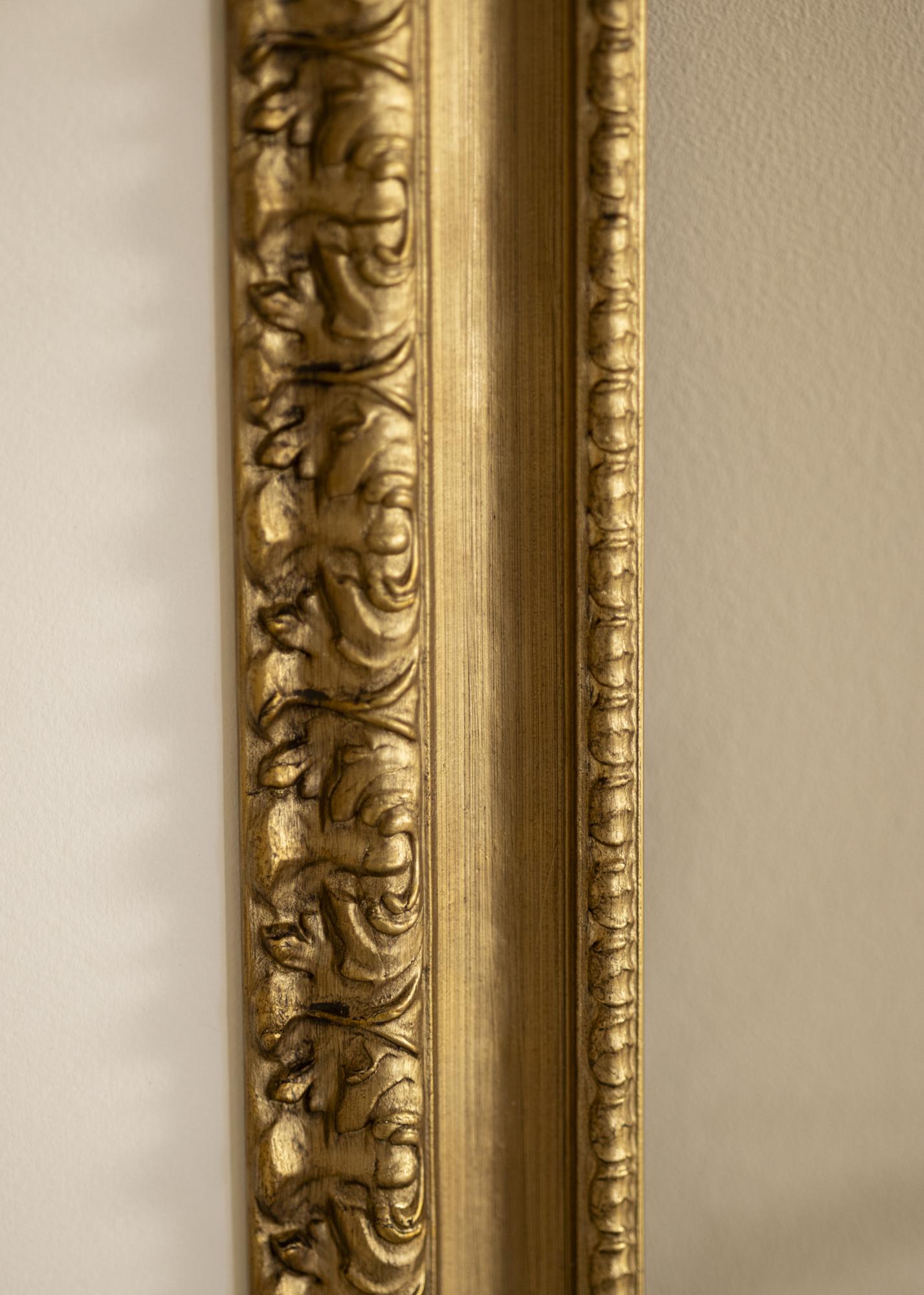 Ram Drottningholm Guld III är en elegant och stilfull fotoram som ger dina bilder en kunglig inramning. Med sin guldfärgade finish och detaljerade, skulpterade dekor längs innerkanten, blir denna tavelram ett vackert komplement till vilket rum som helst. Den mjuka borstningen av ytan framhäver reliefmönstret och ger ramen en lätt åldrad karaktär, vilket skapar en känsla av tidlös elegans.