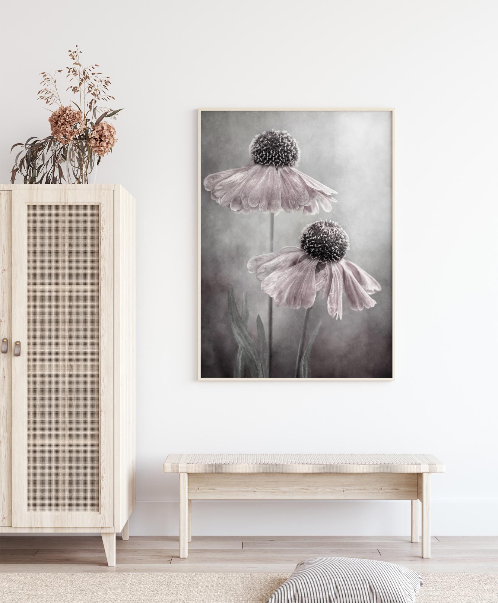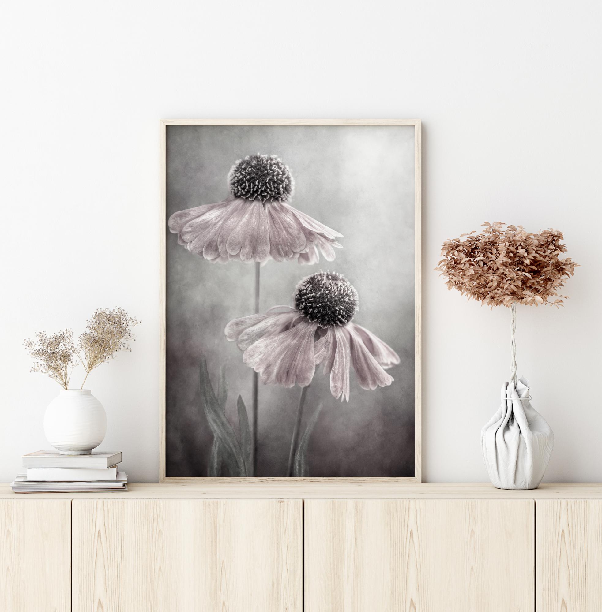 En vacker poster med två tusenskönor som sträcker sig upp mot himlen. De vita kronbladen på tusenskönornas huvuden hänger ner från den runda mitten på blomman. Bakgrunden är en dimmigt grå ton där ljuset skiner igenom för atmosfär. Känn magiken i den här finstämda postern när du hänger den i ett sovrum.