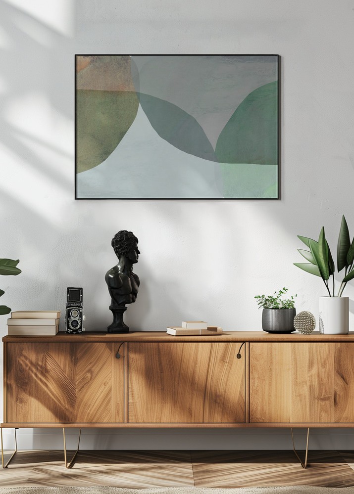 Affischen innehåller en blandning av skogsgrönt, oliv och gråblå nyanser som smälter samman i en organisk komposition. Det stilrena motivet är ett utmärkt tillägg för den som söker en modern och minimalistisk känsla i sin inredning. Denna poster är det perfekta valet för att lyfta fram en naturlig och samtidigt sofistikerad stil i ditt hem.