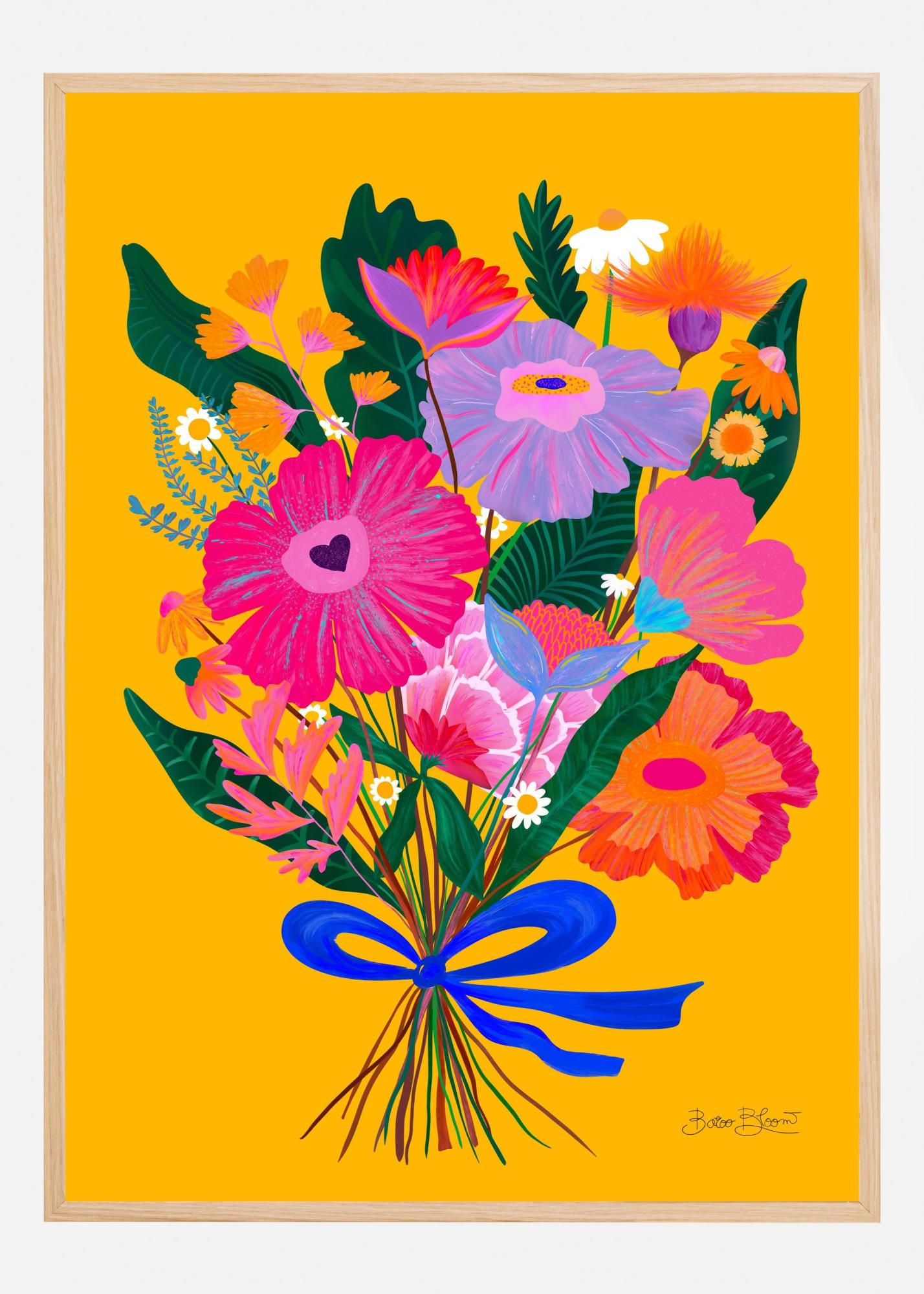 Denna livfulla poster framhäver en vacker blombukett mot en stark, gul bakgrund som genast fångar ögat. De färgglada blommorna i motivet kombinerar nyanser av rosa, lila, orange och rött med stänk av vitt och grönt, vilket ger en känsla av glädje och energi. Varje blomma är noggrant illustrerad för att framhäva detaljer och struktur, vilket gör denna affisch perfekt för att lysa upp vilket rum som helst.