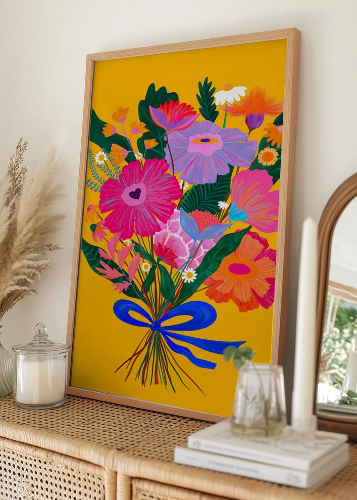 Perfekt som en print för hemmet eller kontoret, detta konstverk erbjuder en härlig mix av varma färger och naturliga element. Den djärva blå rosetten som binder buketten samman ger en elegant kontrast mot den gula bakgrunden. Oavsett om du söker en modern affisch för vardagsrummet eller en färgglad detalj till din konstsamling, kommer detta motiv att tillföra en touch av stil och elegans.