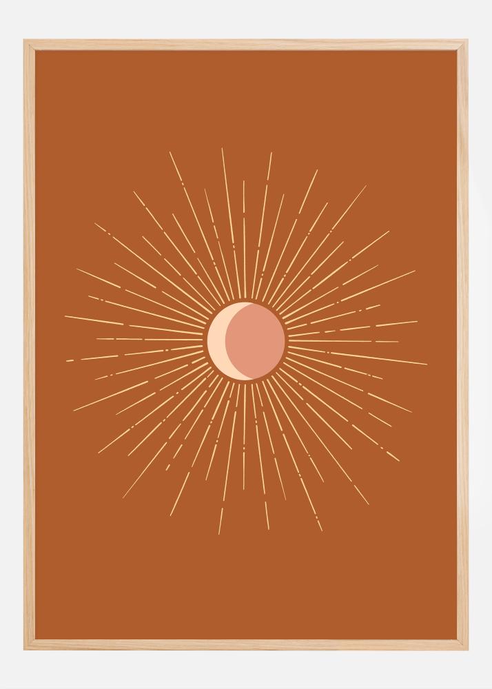 Denna minimalistiska och elegant designade poster med en abstrakt solförmörkelse blir en stilren och modern accent på vilken vägg som helst. Med dess rena linjer och strålande motiv mot en djup terrakottabakgrund, representerar denna print en perfekt blandning av enkelhet och sofistikering. Det centrala elementet i designen, en cirkel med en explosion av linjer, symboliserar ljus och energi, och lägger till en dynamisk effekt i rummet.