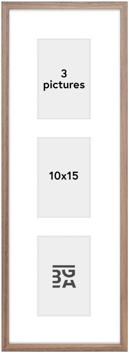 Den minimalistiska designen sätter motivet i fokus, för att dina favoritbilder ska hamna i blickfånget. Ramen finns i flera utföranden, varav denna är en variant i ljus valnöt med plats för 3 bilder i storlek 10x15 cm.